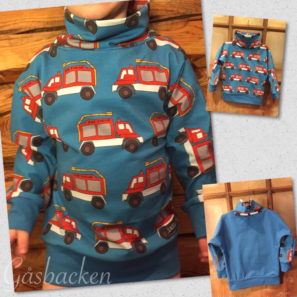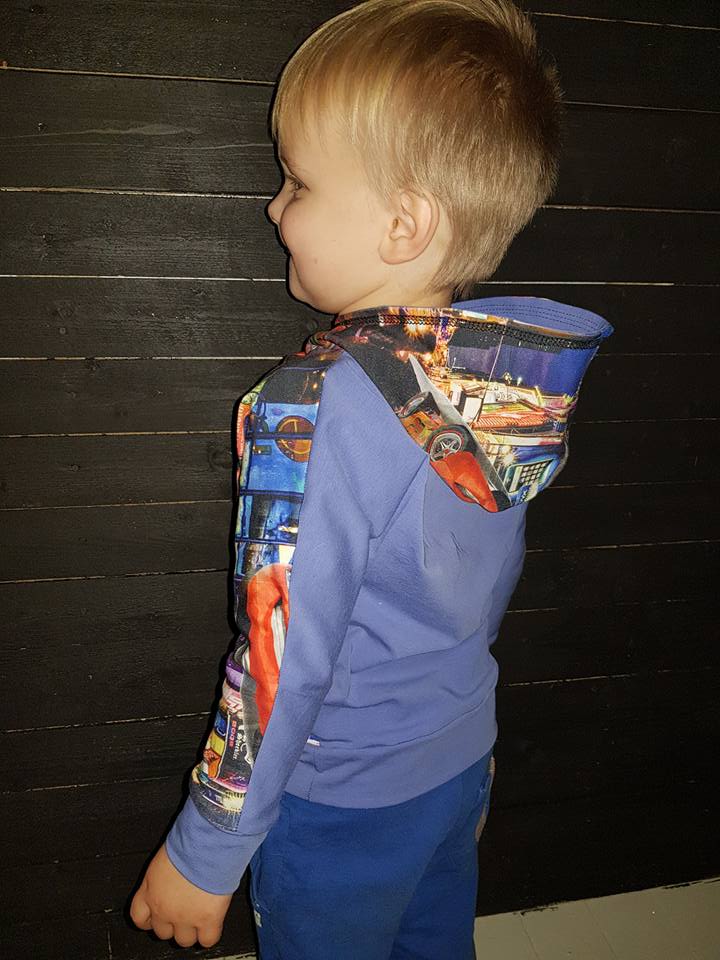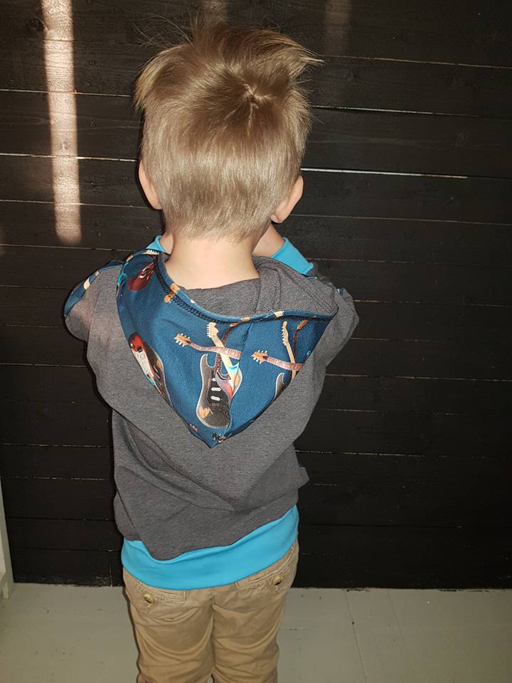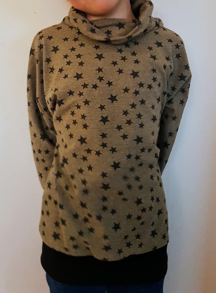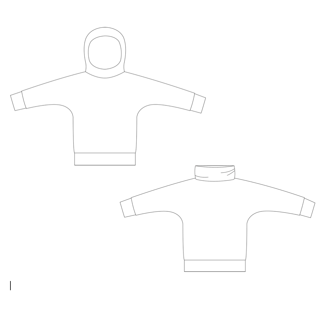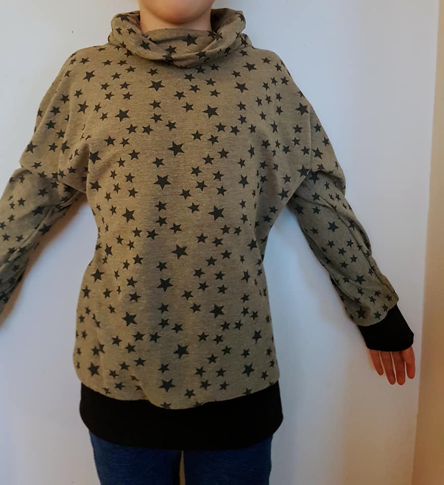 Material: Tröjan är designad för att sys i trikå med ev mudd i ärmslut och höftdel, men fungerar även fint att sys i tunnare jogging/sweatshirttyg.