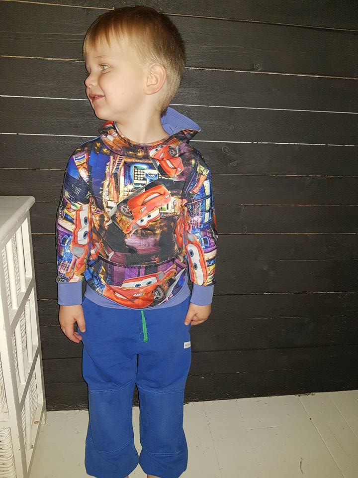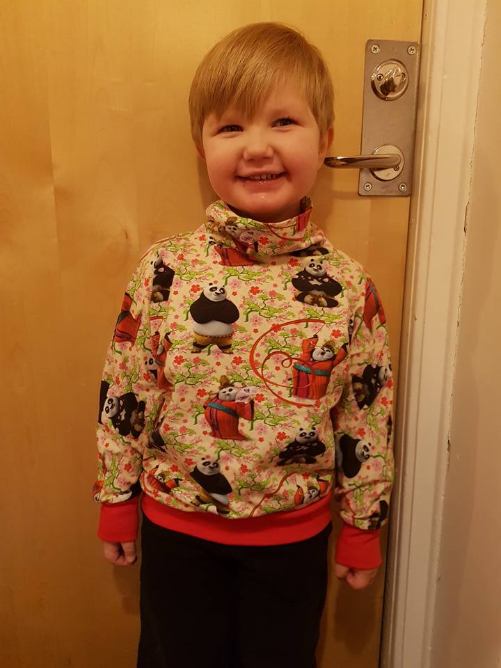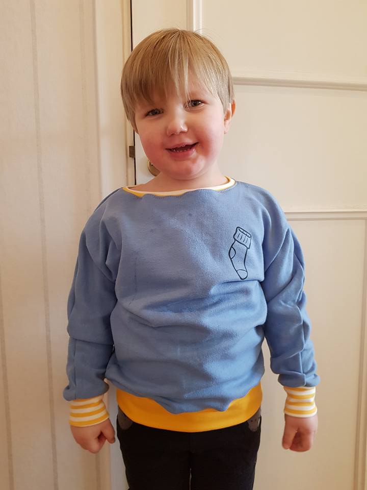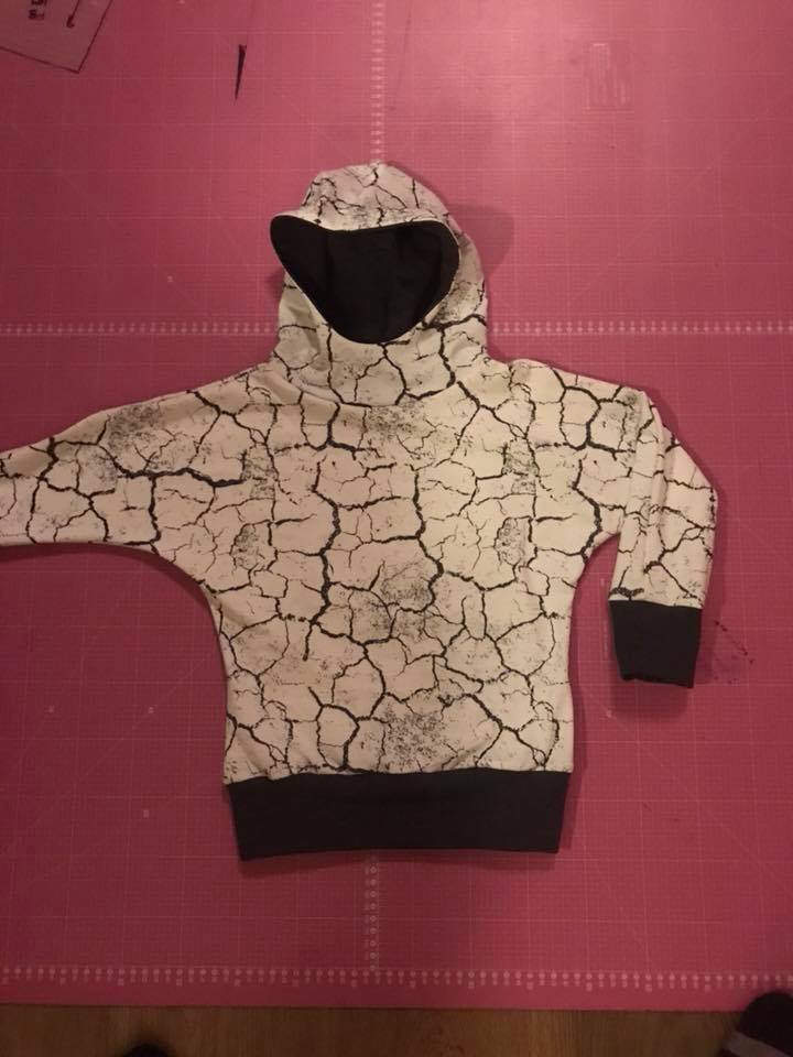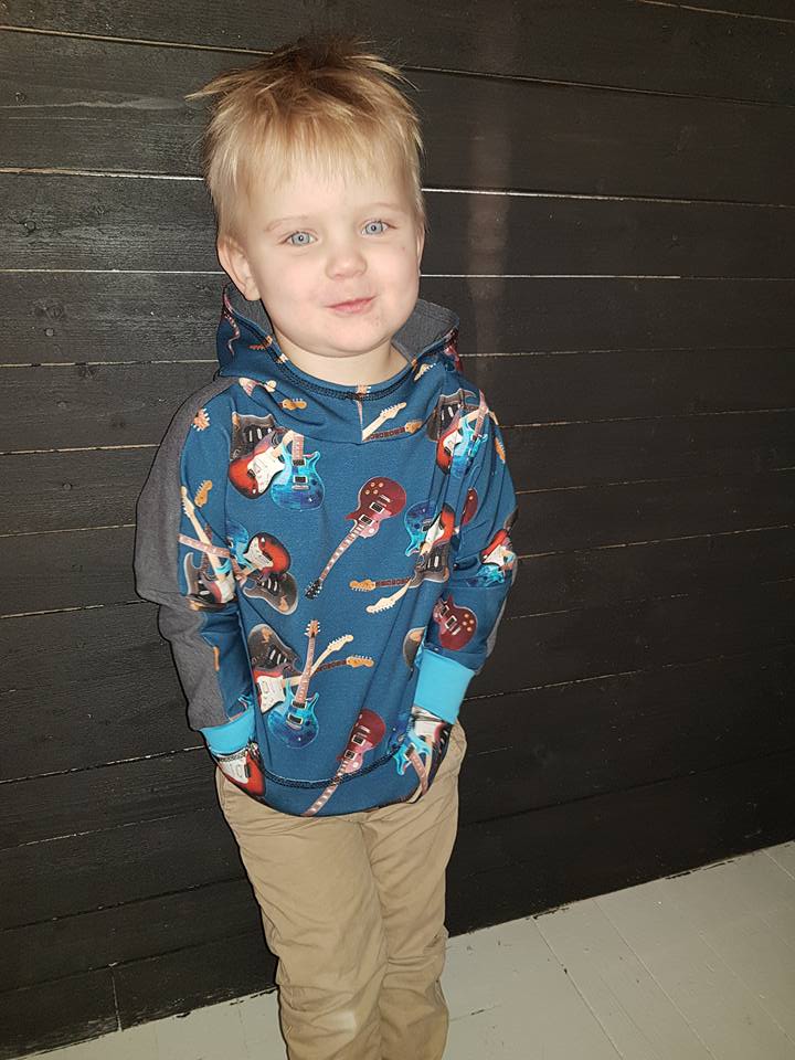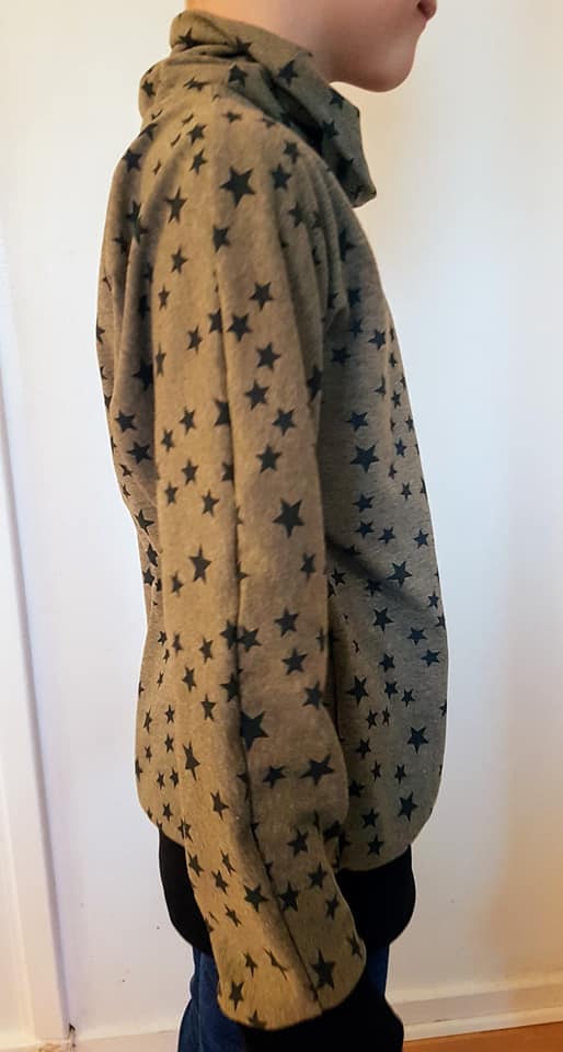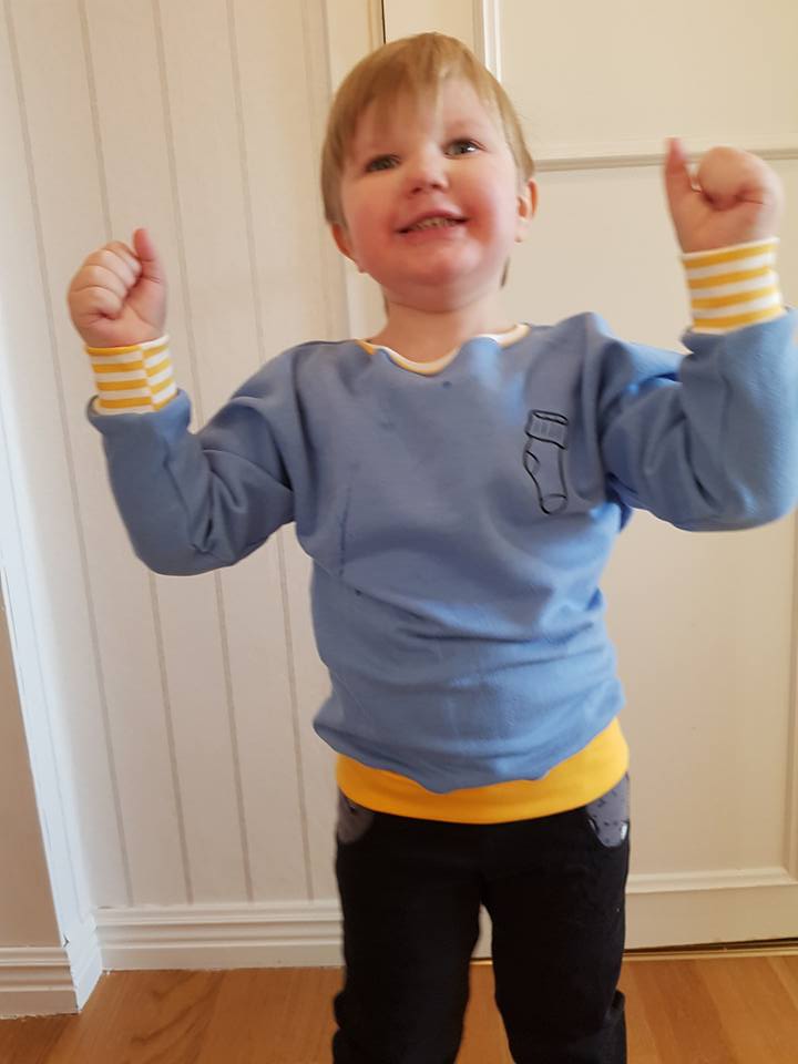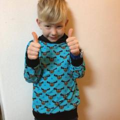 Material: Tröjan är designad för att sys i trikå med ev mudd i ärmslut och höftdel, men fungerar även fint att sys i tunnare jogging/sweatshirttyg.