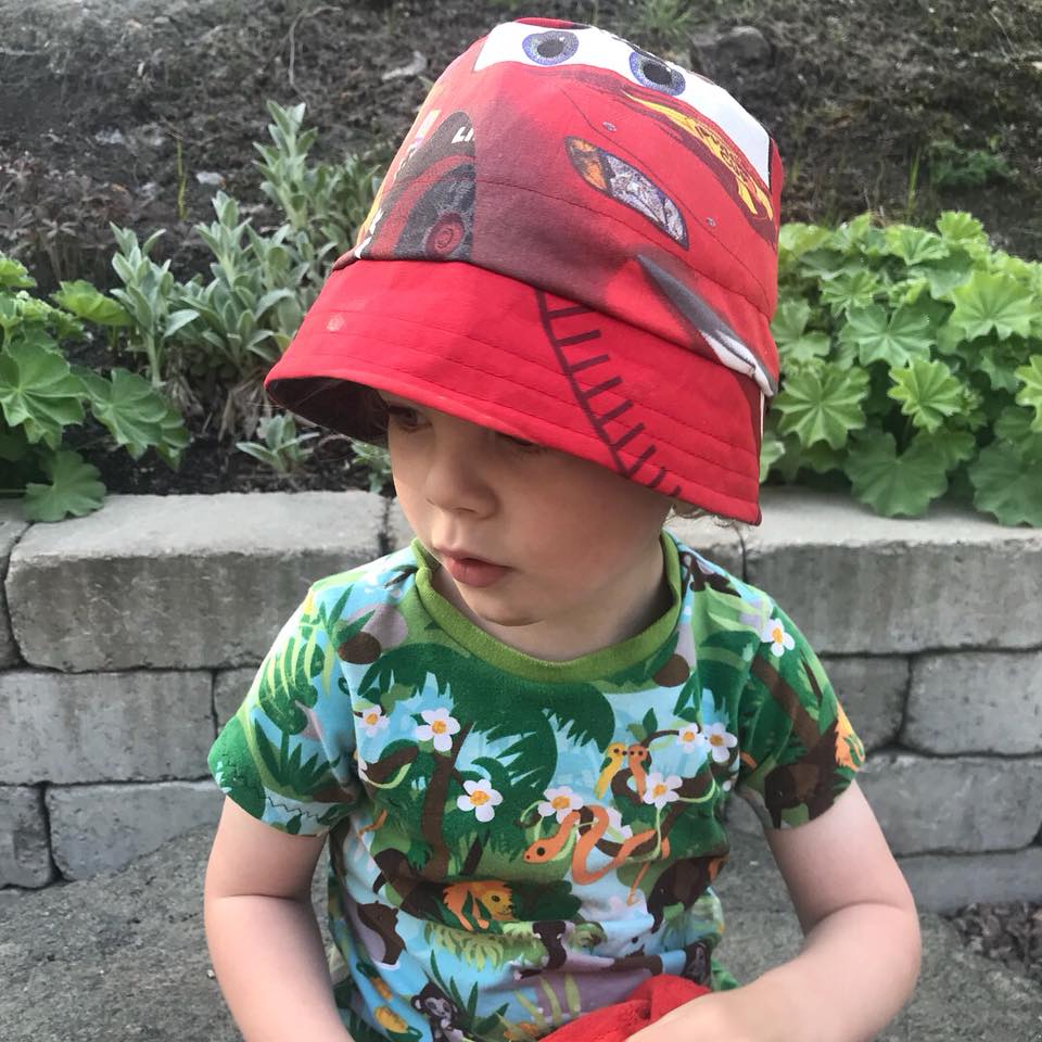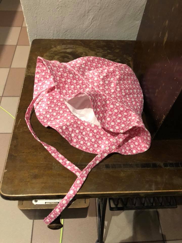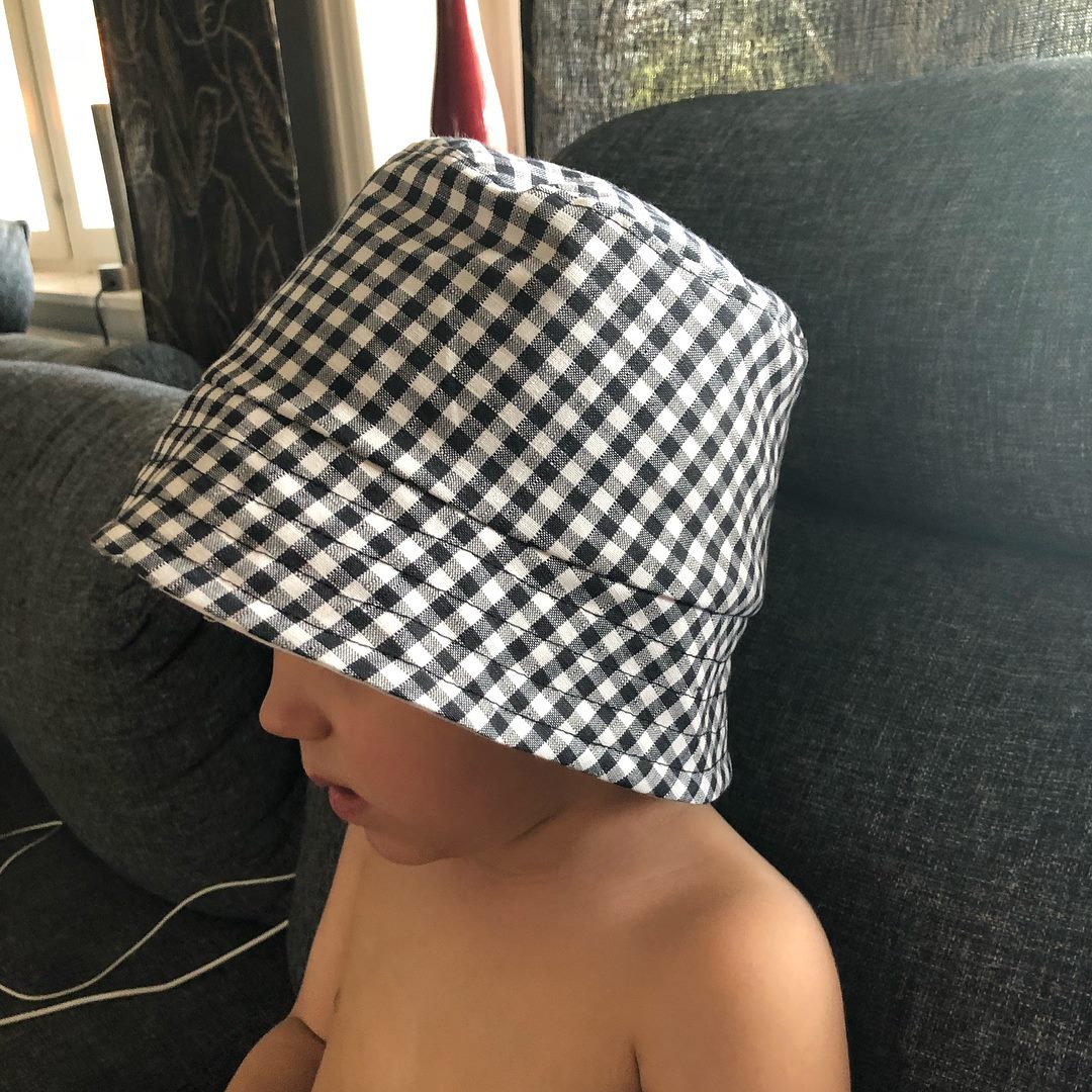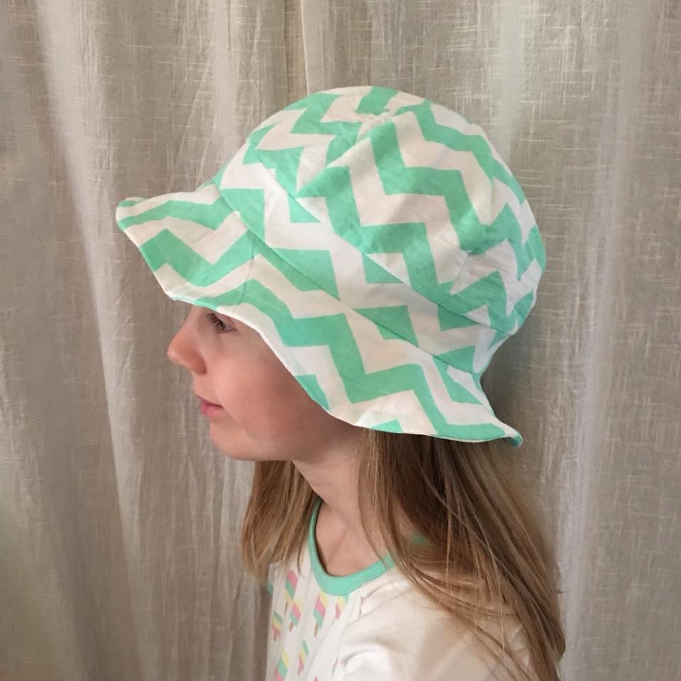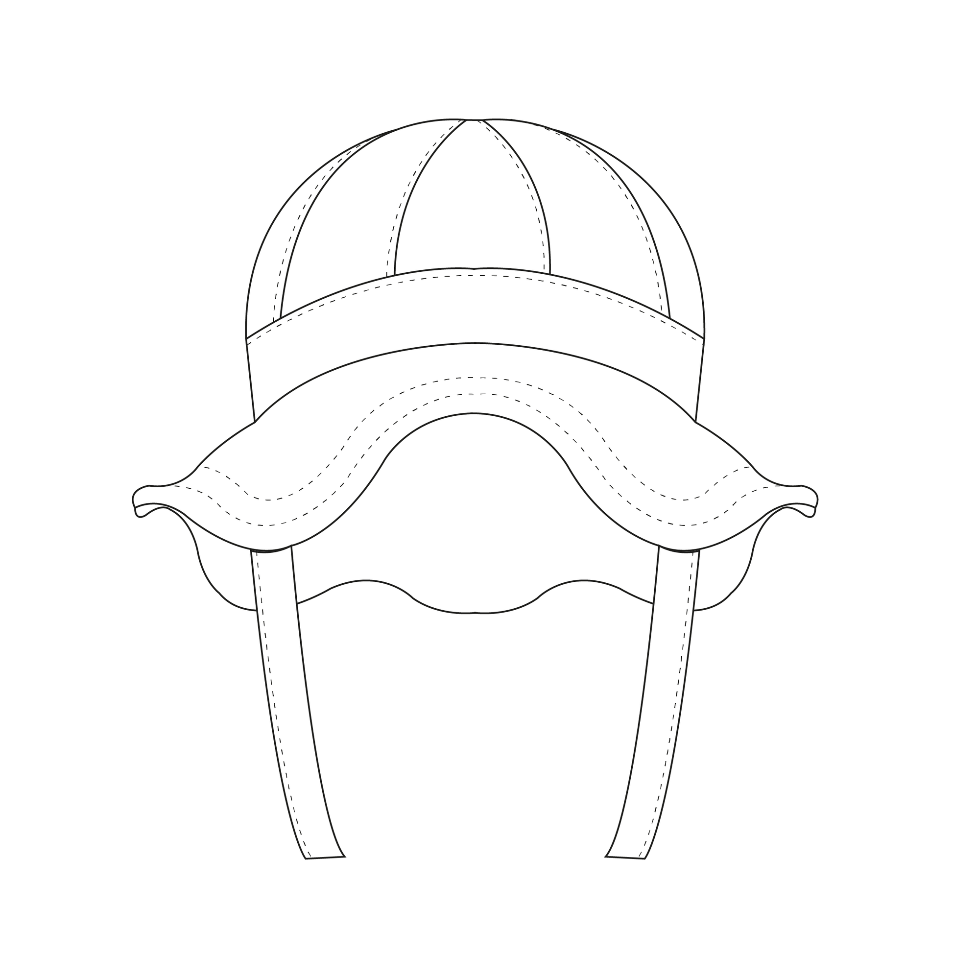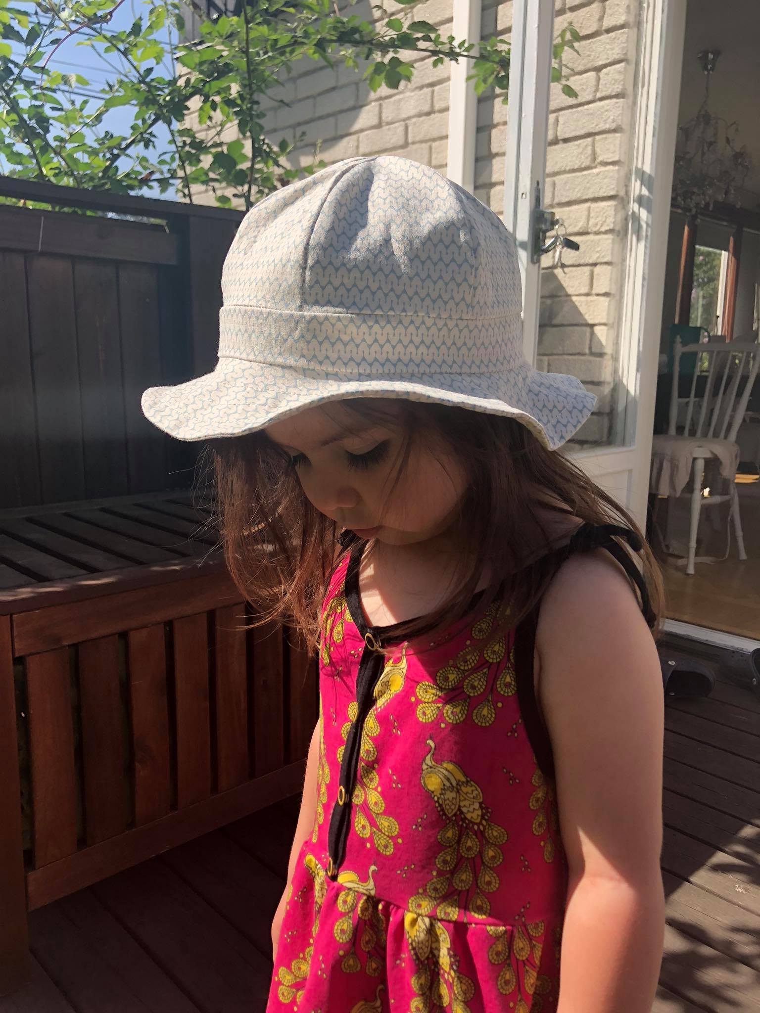Denna solhatt går att sy i två modeller; antingen en variant med klockformad topp med kilar och ett lite vågigt brätte med eller utan knytband eller en fiskehattsmodell med rakt sidostycke och en kanal med rund resår inuti för att kunna justera vidden en aning. Modell 1 (med kilarna) går upp till strl 56-60 och modell 2 (fiskehattsmodellen) går upp till strl 60-64 (herr).