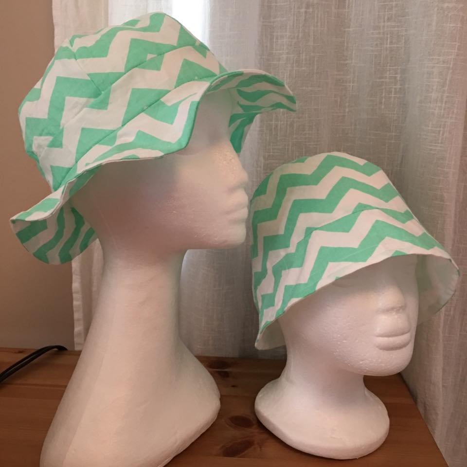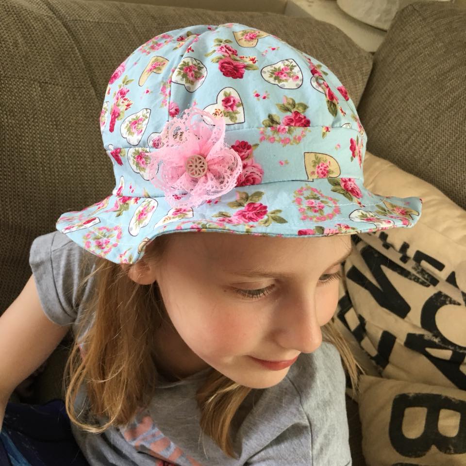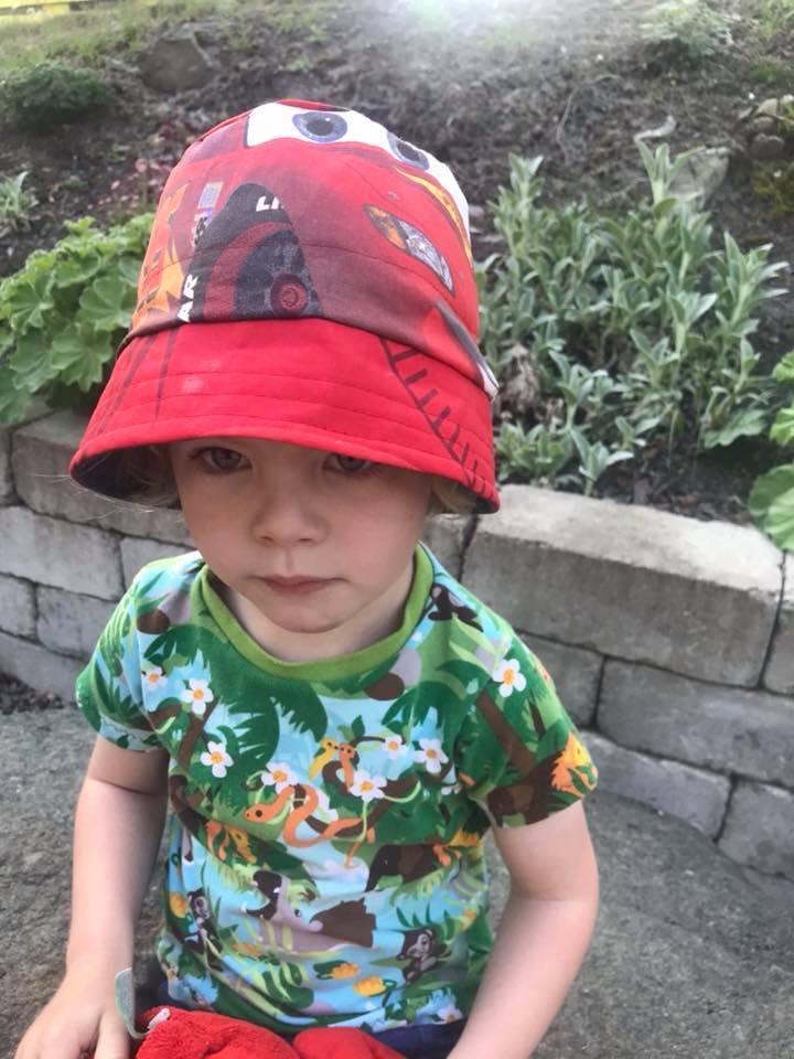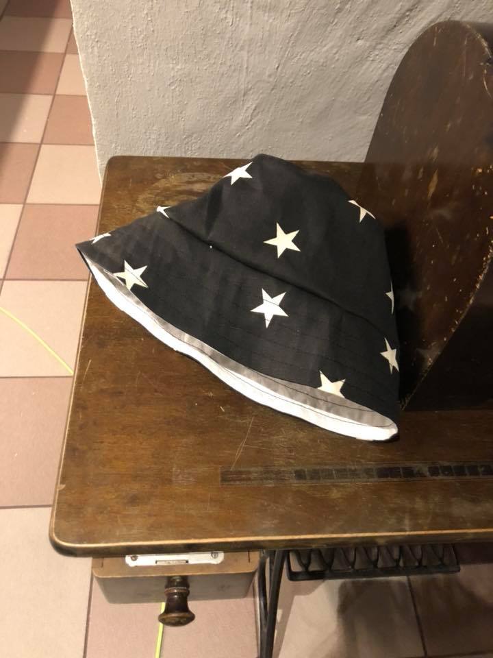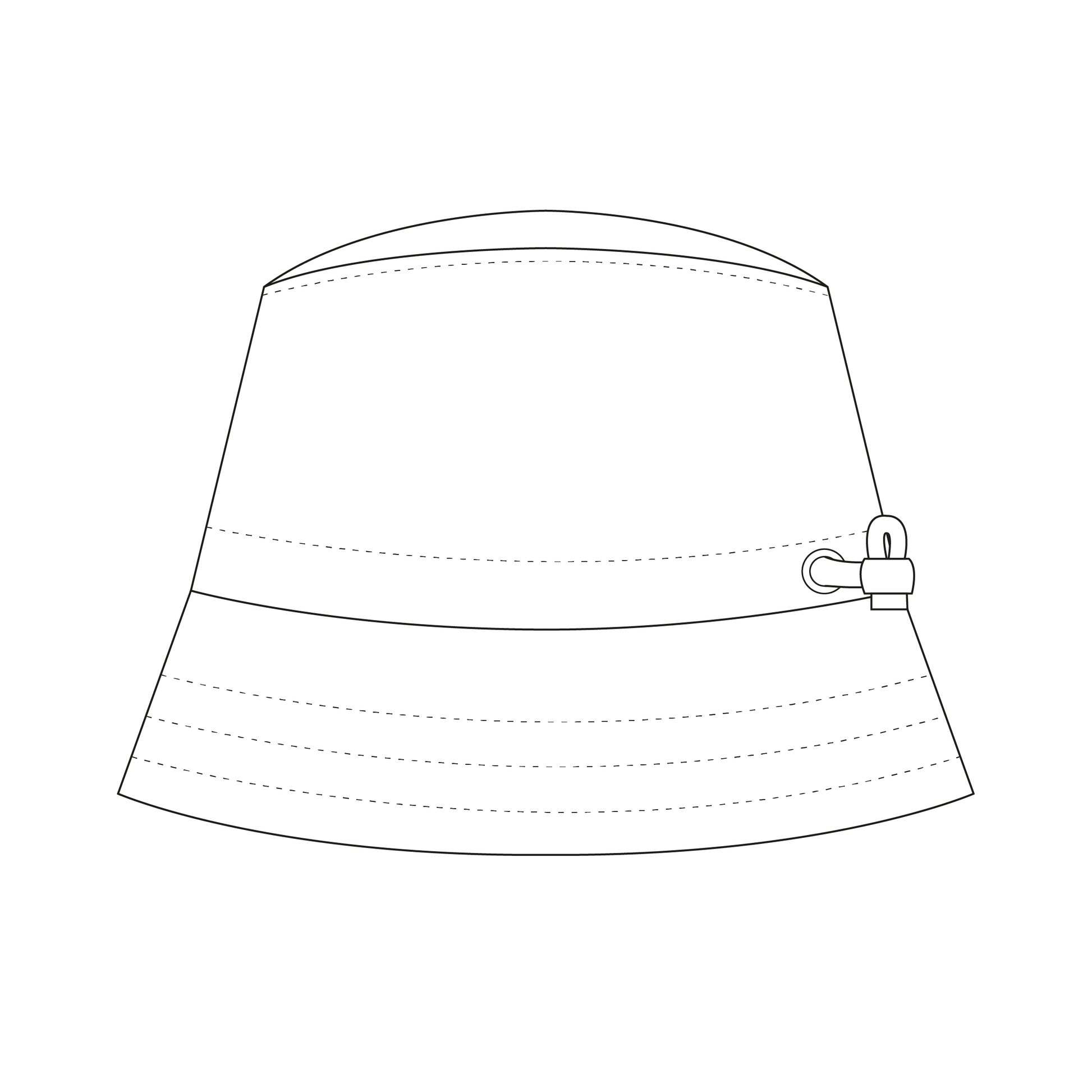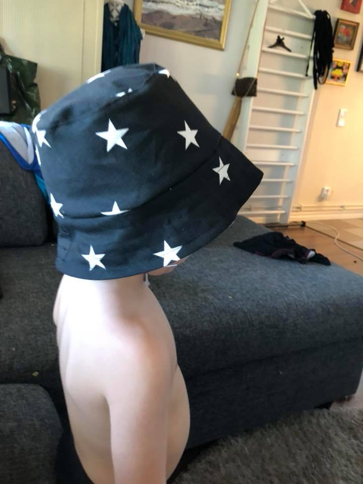Denna solhatt går att sy i två modeller; antingen en variant med klockformad topp med kilar och ett lite vågigt brätte med eller utan knytband eller en fiskehattsmodell med rakt sidostycke och en kanal med rund resår inuti för att kunna justera vidden en aning. Modell 1 (med kilarna) går upp till strl 56-60 och modell 2 (fiskehattsmodellen) går upp till strl 60-64 (herr).