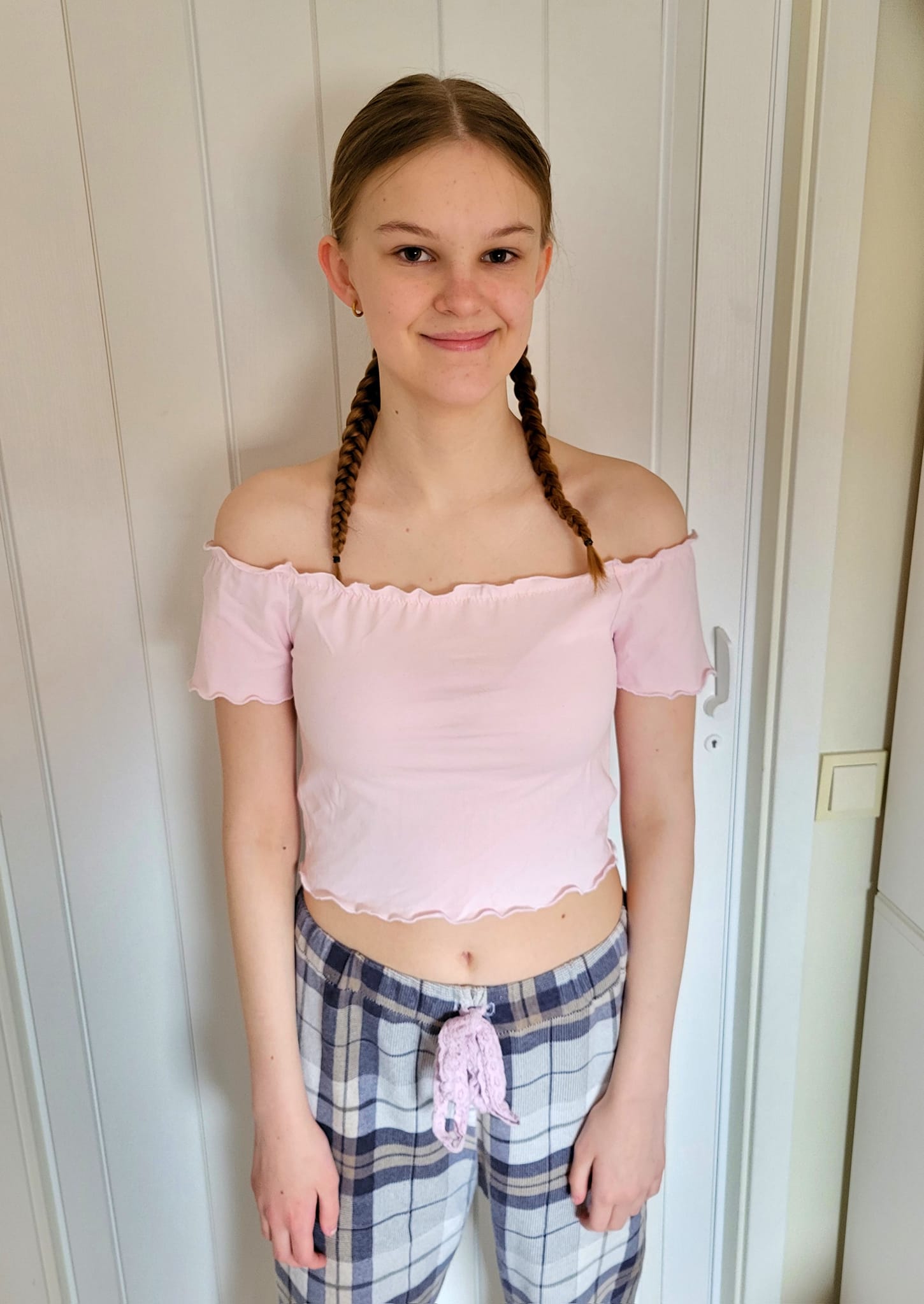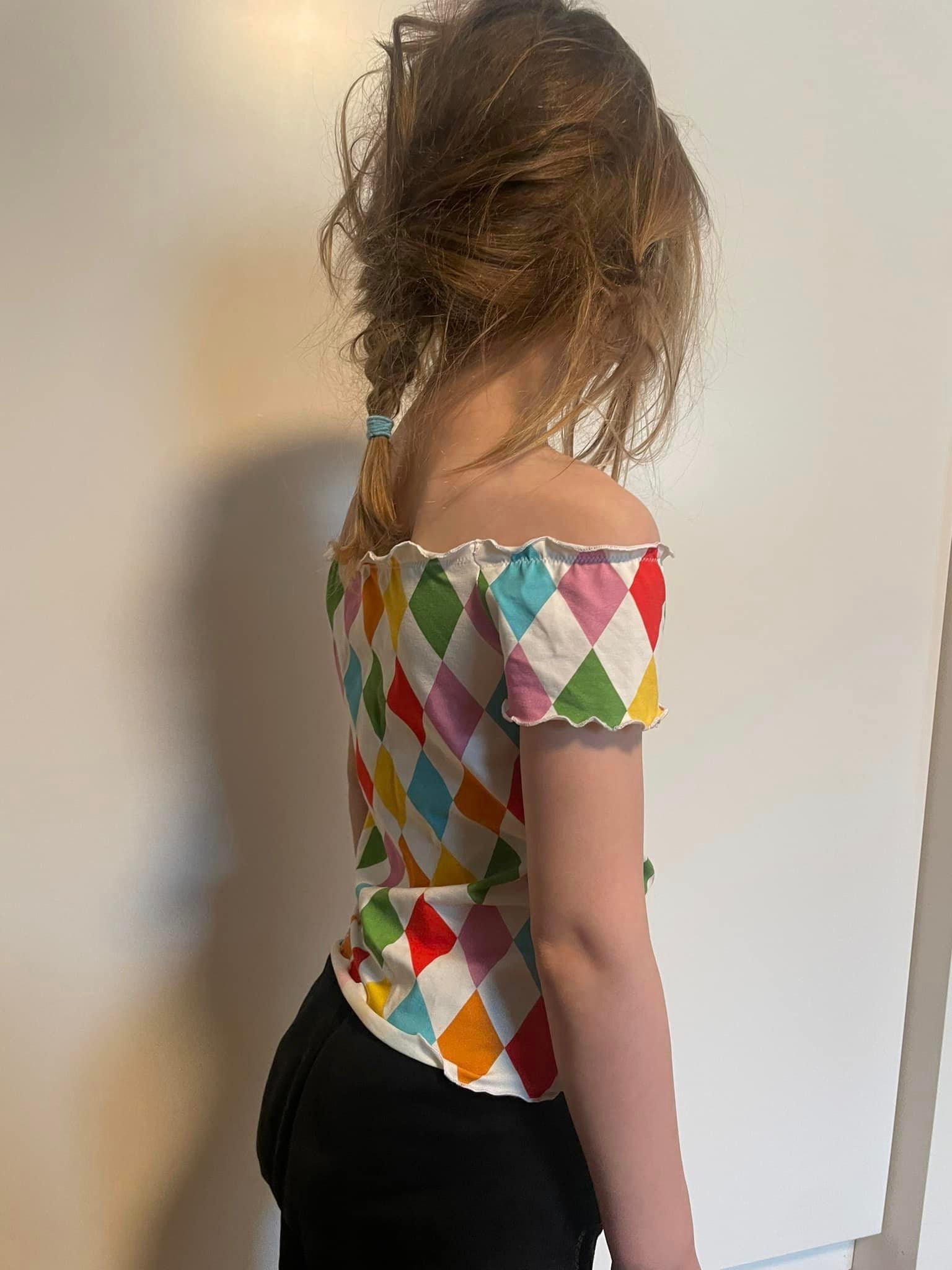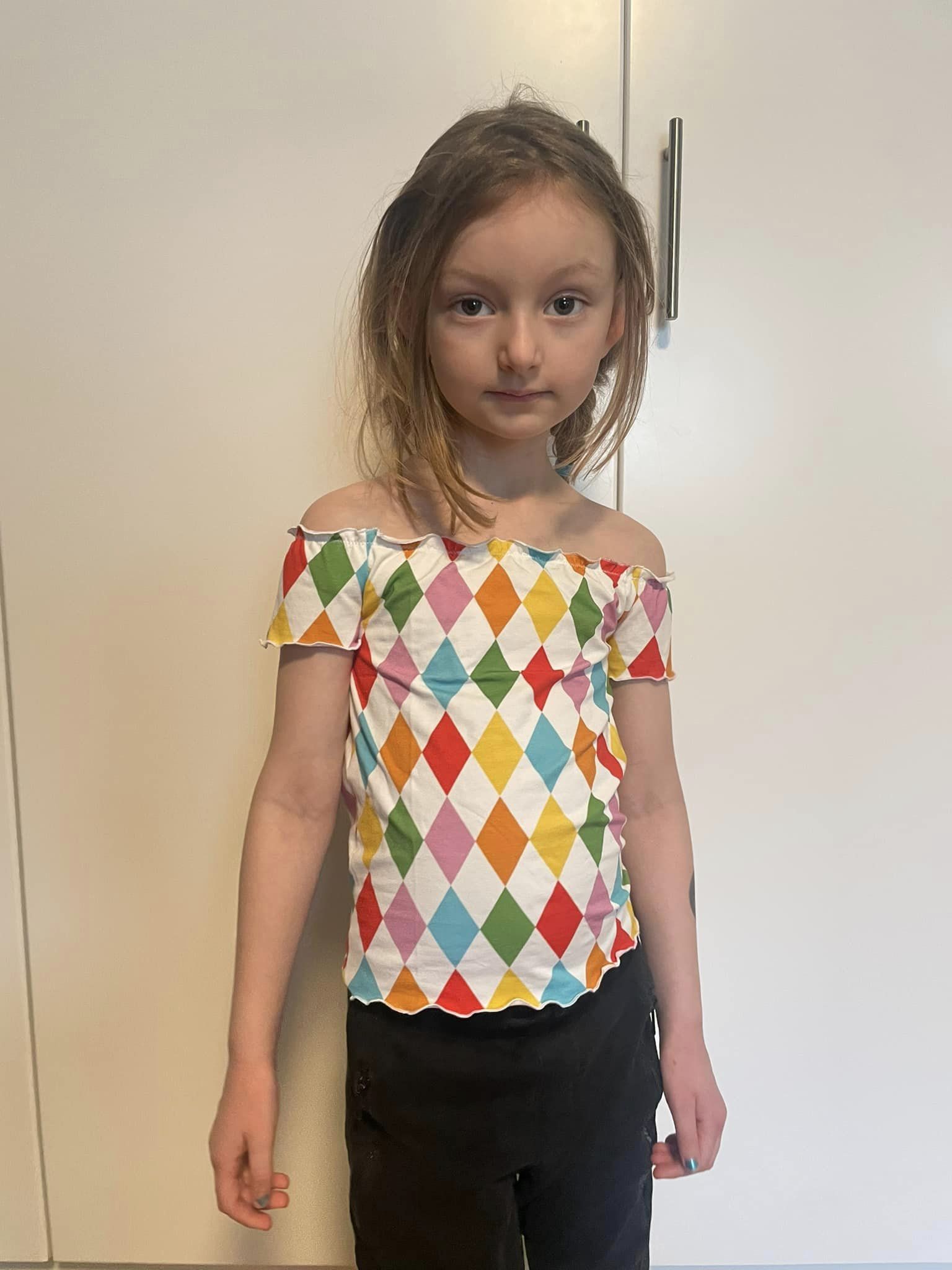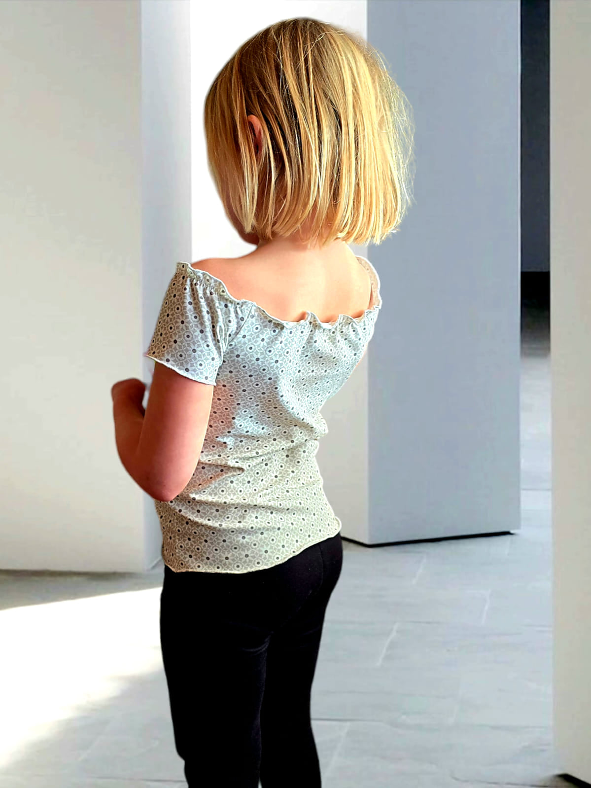 Material och tillklippning: Modellen sys i ribbad eller slät trikå/jersey. 0,5 cm resårband tillkommer till halsringningen.