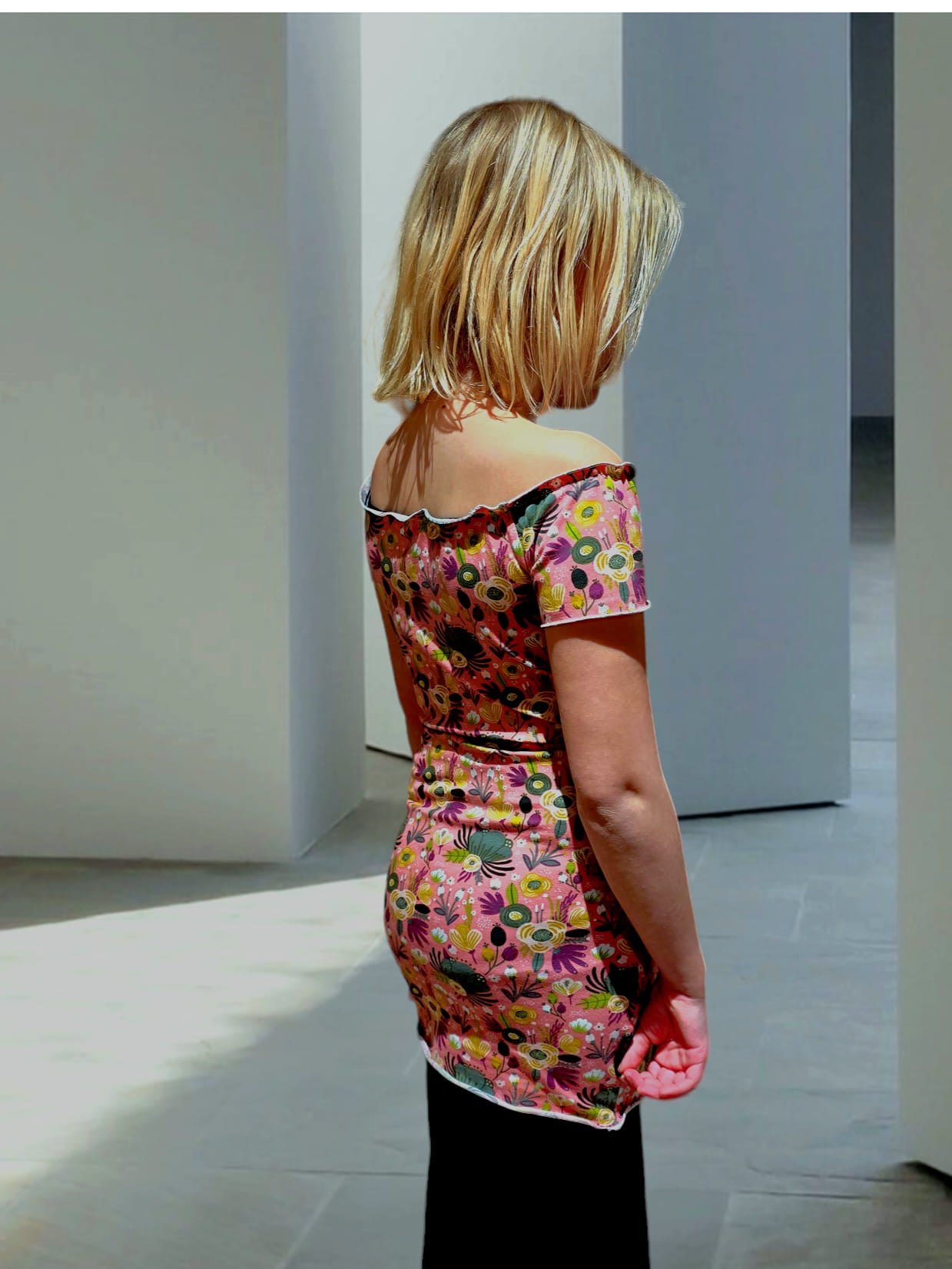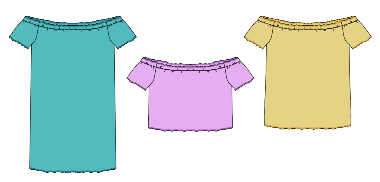 Sweetheart Dress är precis som namnet antyder en supersöt modell med nedhasade axlar med resår och rullfållar (går även att sy med tät zigzag eller supersmal fåll). Modellen är figurnära och kan sys som klänning, top eller crop top. Den är dessutom extremt snabbsydd så passar utmärkt att massproducera till sommaren.