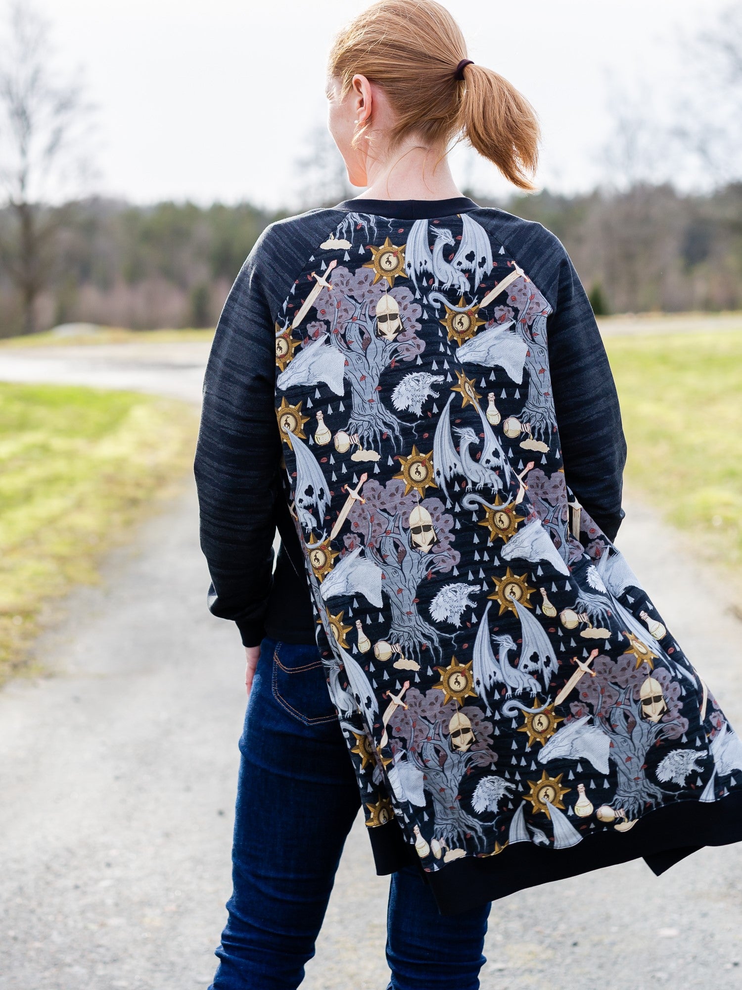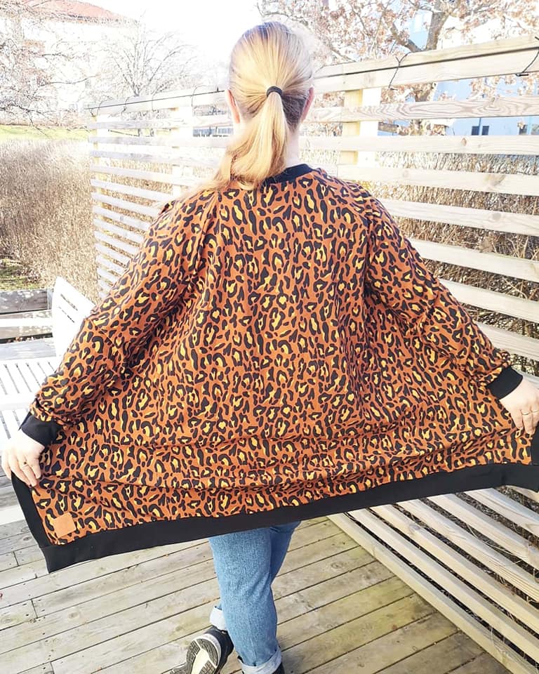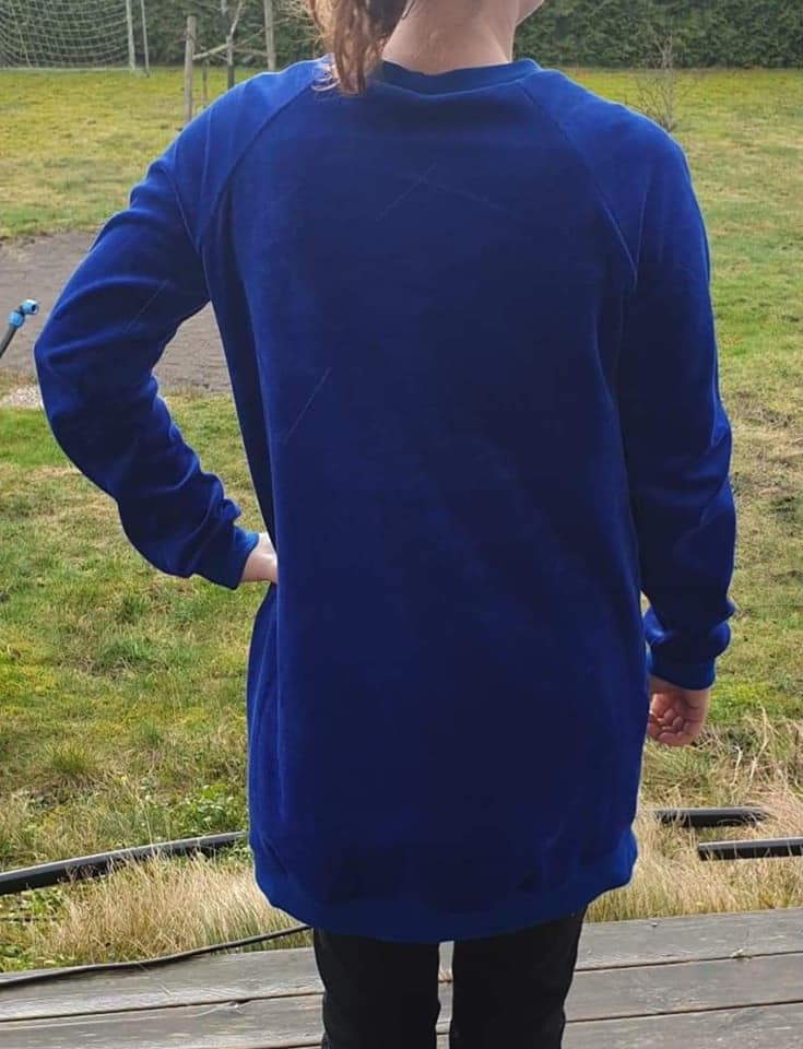 Material och tillklippning: Tröjan sys i trikå eller tunnare jogging med mudd eller annat mkt elastiskt tyg i halsringning, ärmslut och nederkant. Fickan klipps i fuskskinn.