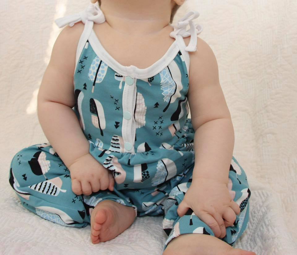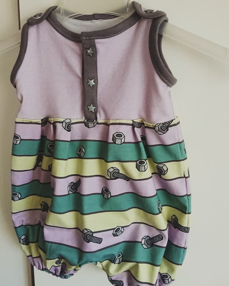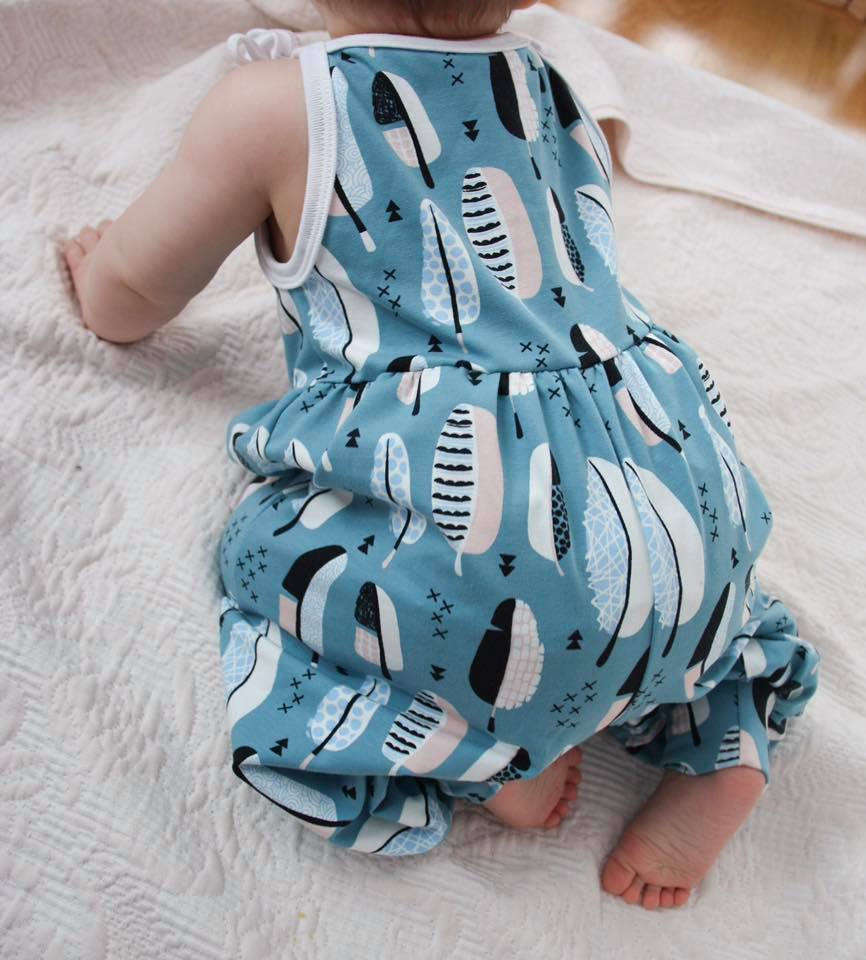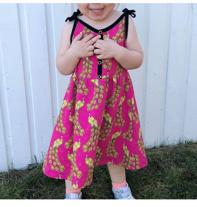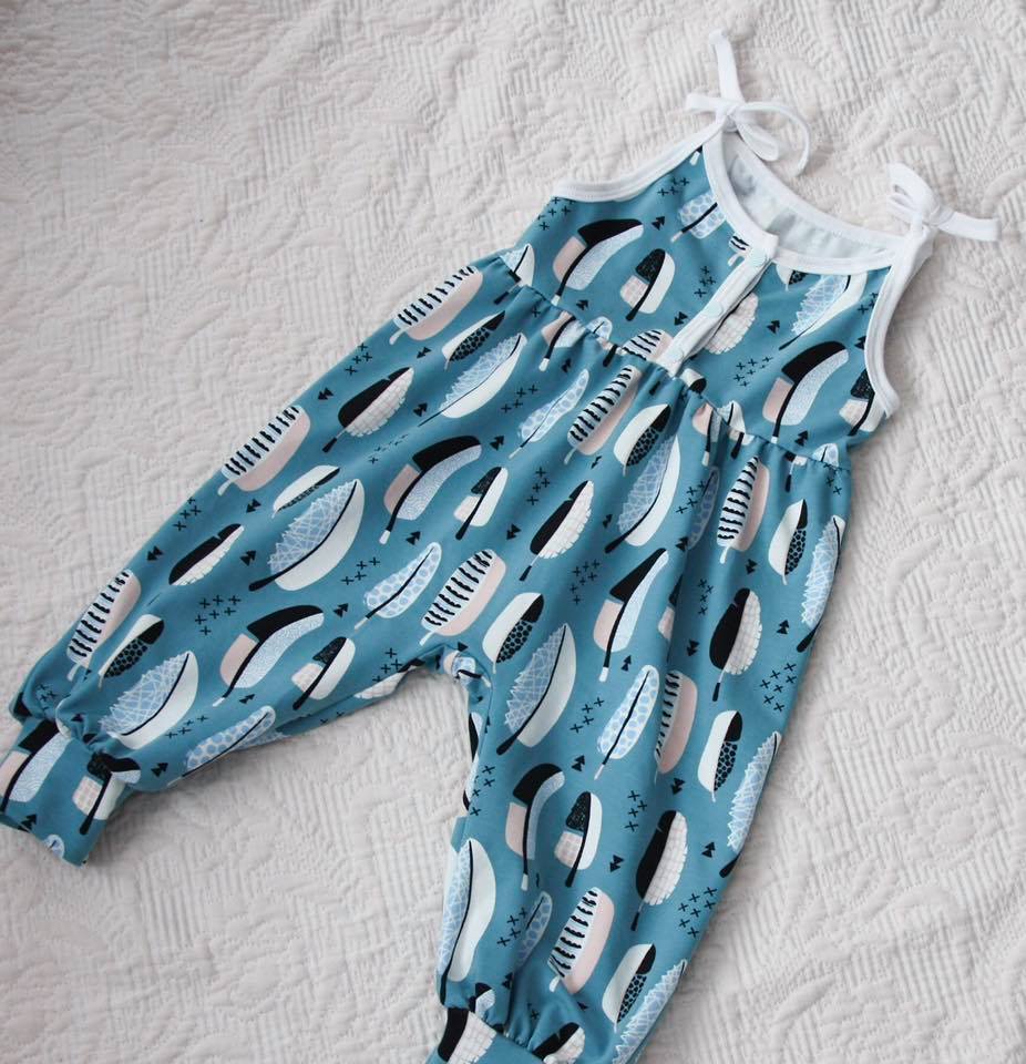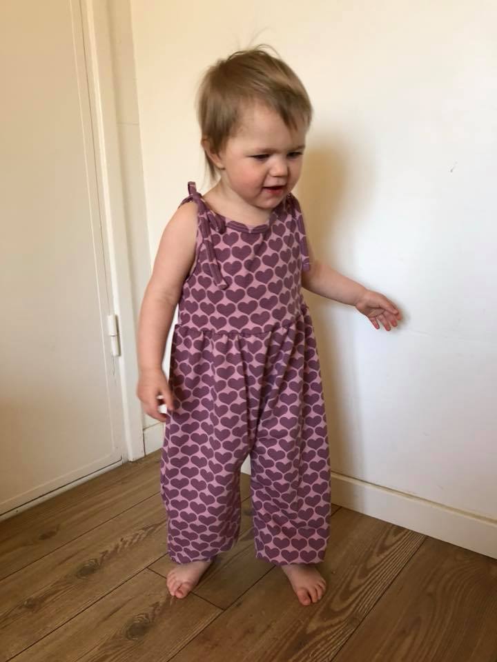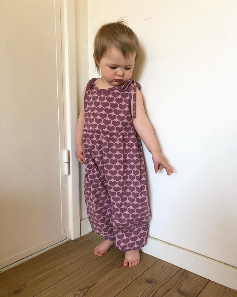 Tracys Tornado Jumpsuit är en solklänning/byxdress med ledig passform och söt knäppning fram på livet. Man kan sy den antingen med kjol, korta ben med kantband eller resårkanal eller långa ben med muddavslut. Axelbanden kan göras med eller utan knyt, och grenen antingen med söm eller med knäppning för enkla blöjbyten/toalettbesök.
