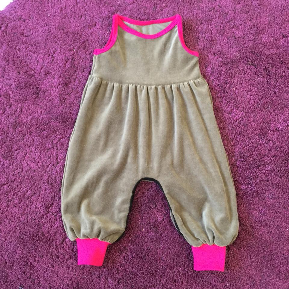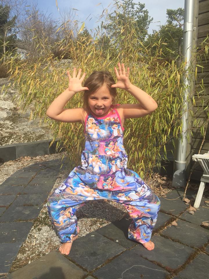 Material och tillklippning: Denna modell är tänkt att sys i trikå/jersey, men har under provsömnaden även sytts i vävt bomullstyg med gott resultat. Utöver trikå/jersey behövs mudd/interlock för bandkantning samt ev knytband och tryckknappar till livets knäppning och eventuell grenknäppning.