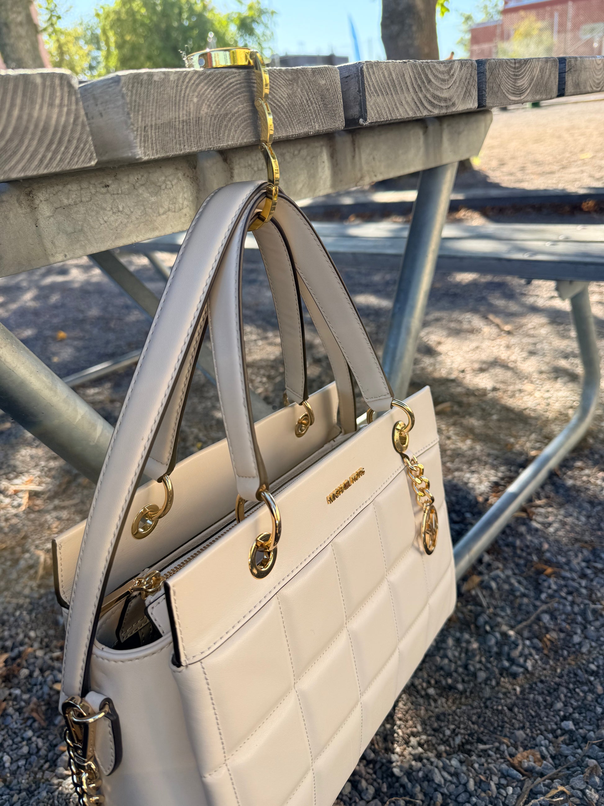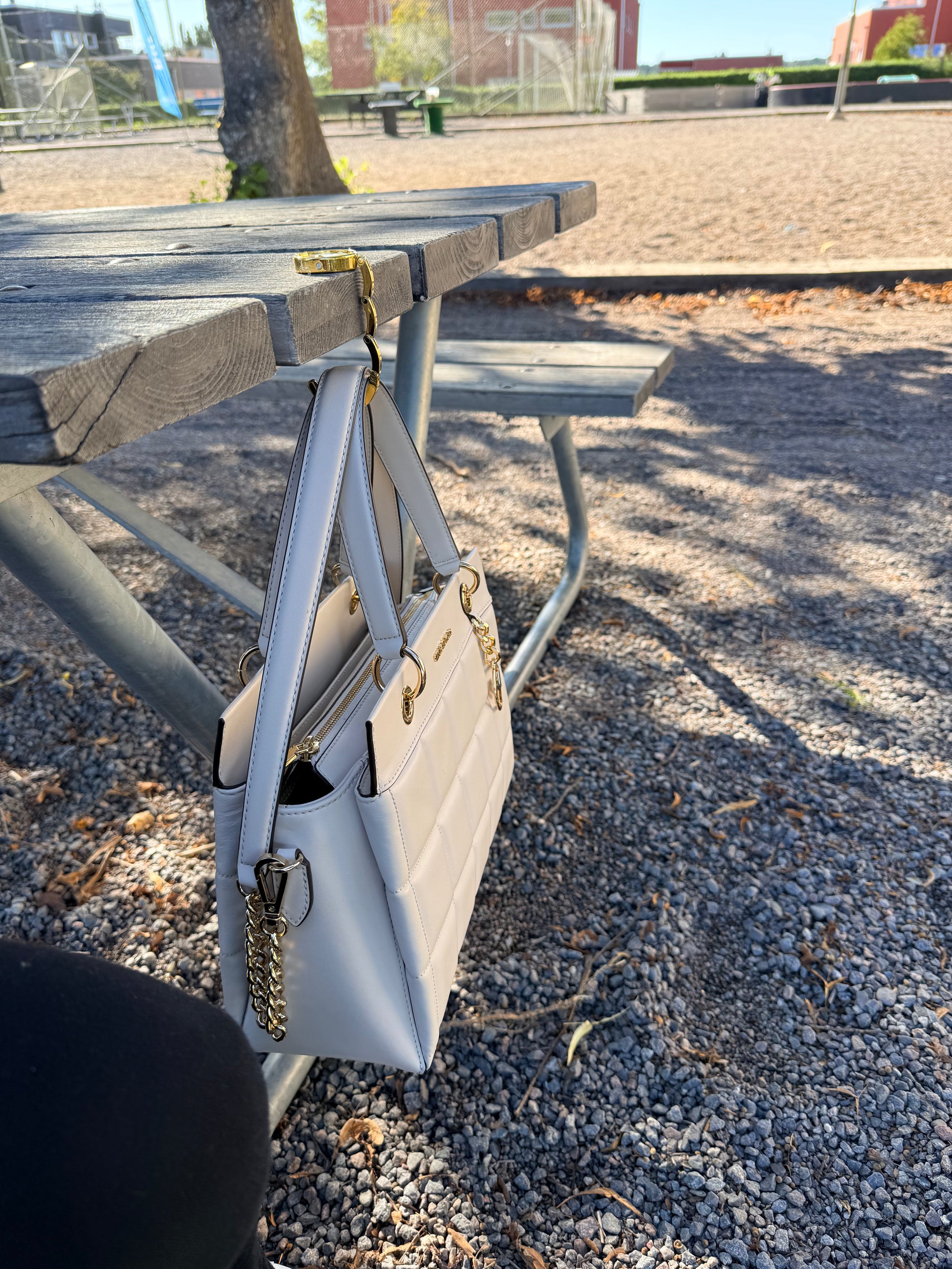 Världens smartaste lilla pryl som tar minimalt med plats och gör att du kan hänga upp handväskan på vilket bord eller bardisk som helst för att slippa ställa den bredvid dig, på golvet eller i knäet eller hängande bakom stolen utan uppsikt! Själva kroken viks ihop och sitter med en magnet runt mittdelen (som har antiglidundersida) och ihopfälld är den inte mycket större än en gammal femkrona.