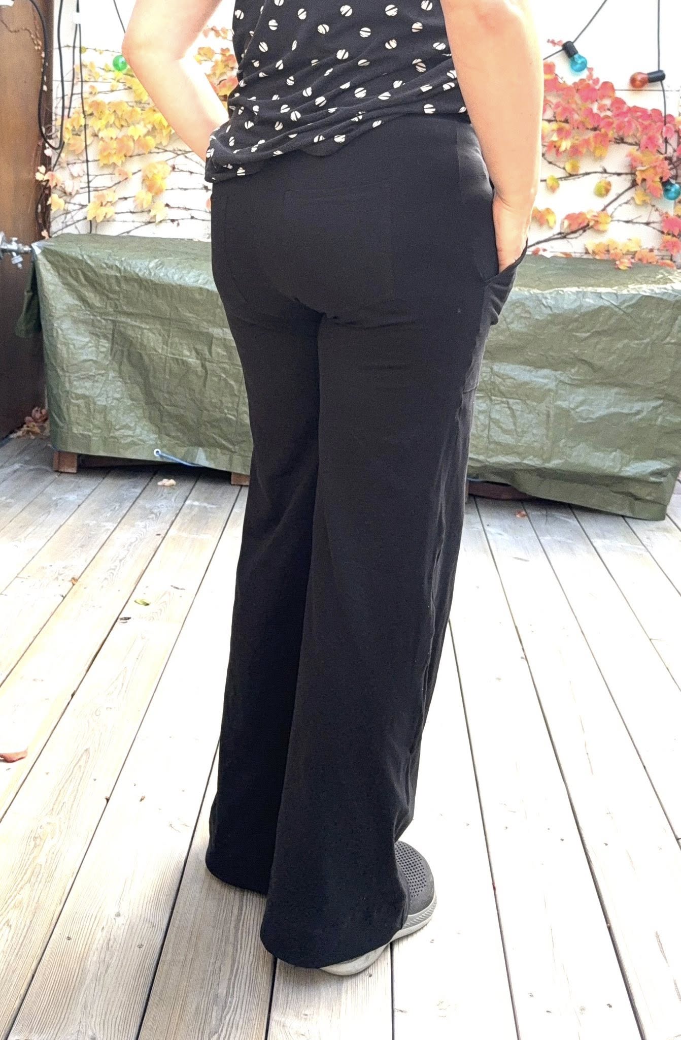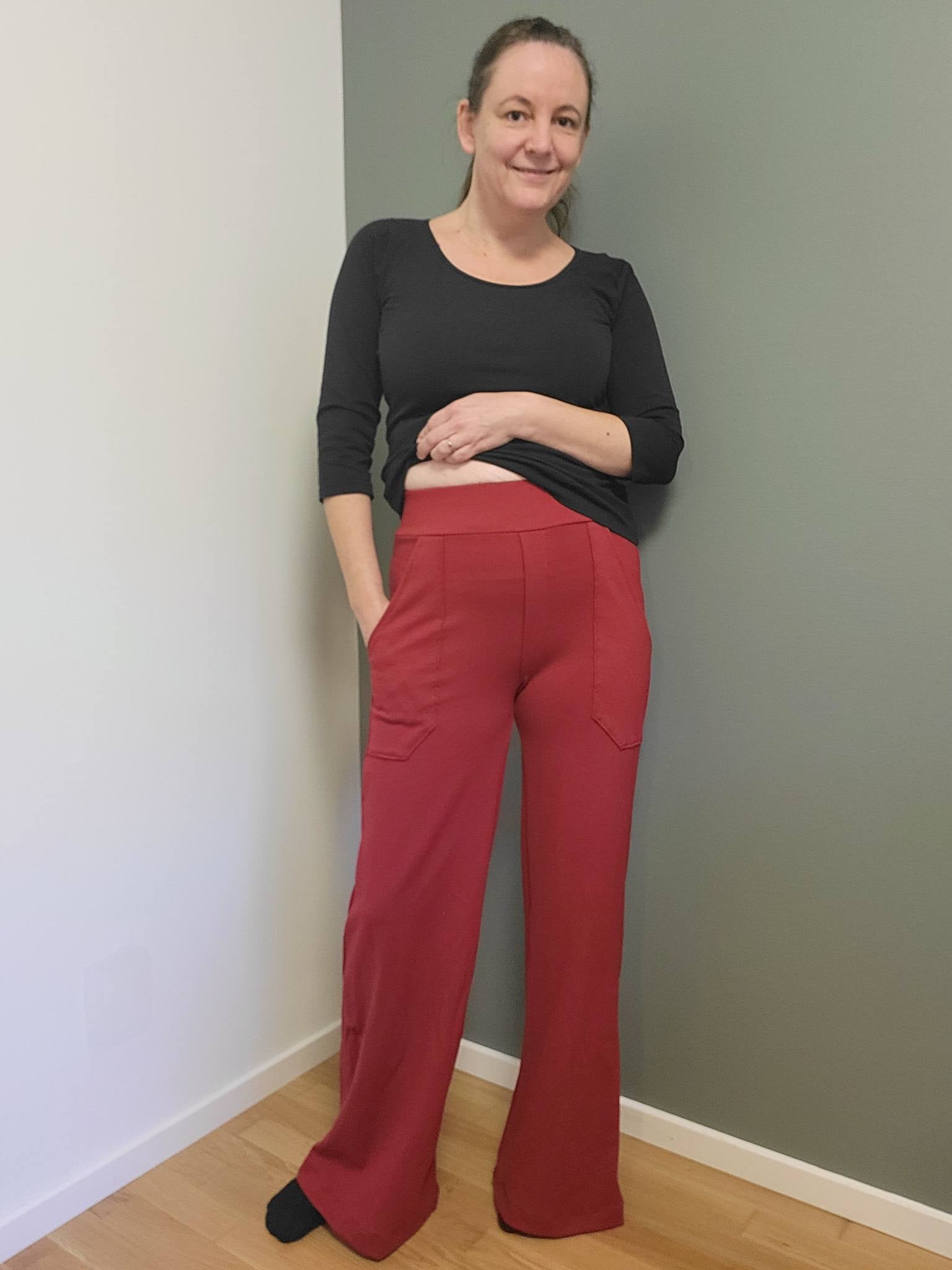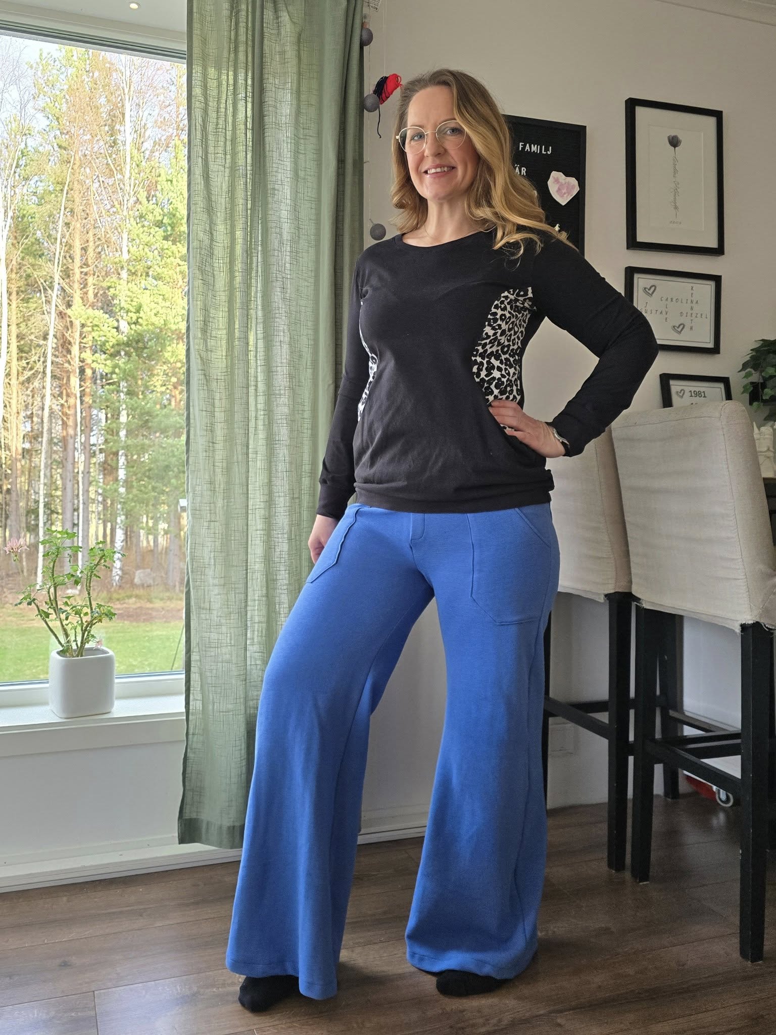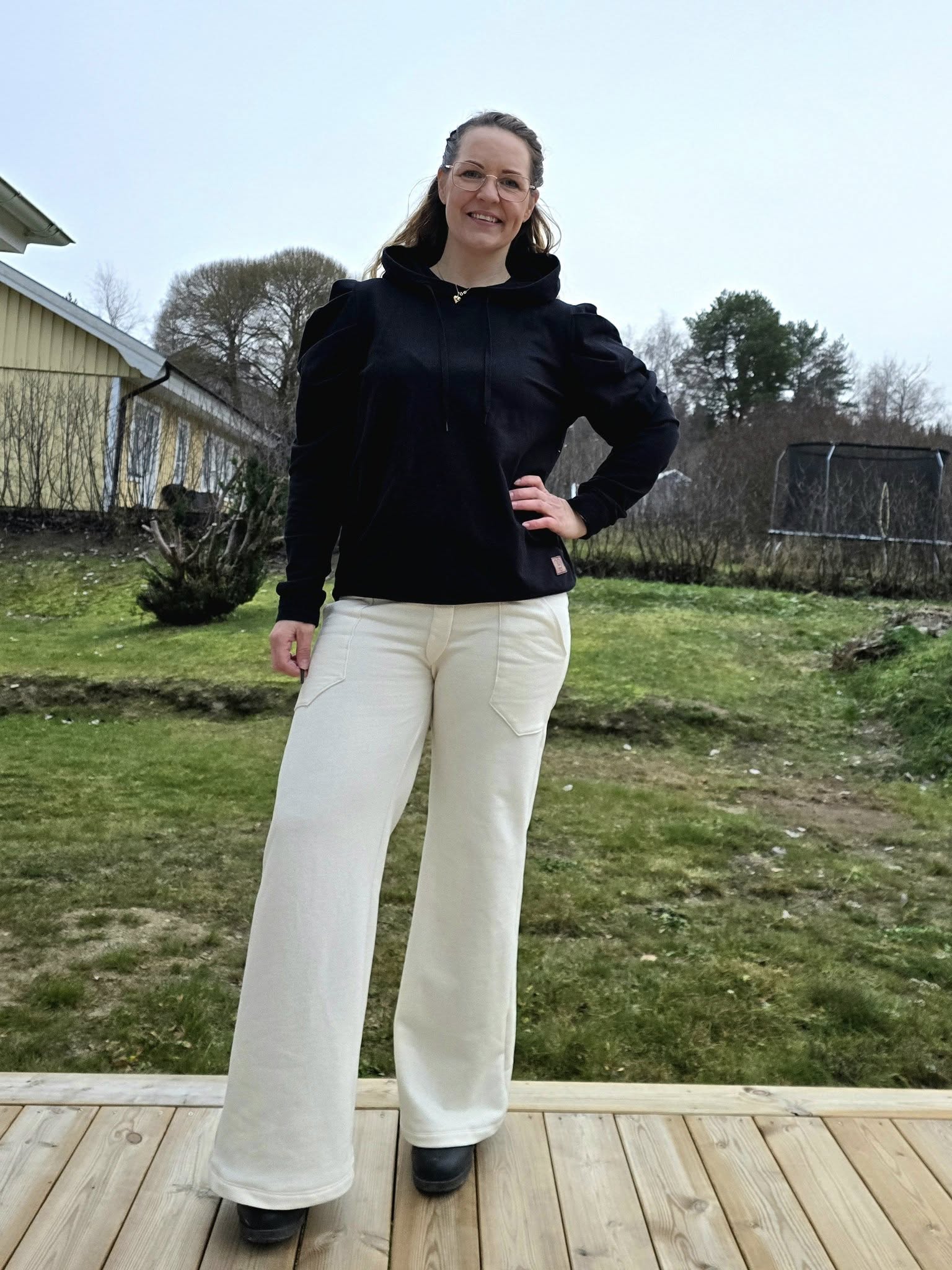 Material och tillklippning: Sys i stretchiga tyger med stretch på både bredd och höjd (har tyget inte stretch på höjden kan man behöva kompensera detta genom att höja dem ett par cm baktill), till exempel tunnare stretchjeans, stadig jersey eller andra modetyger.