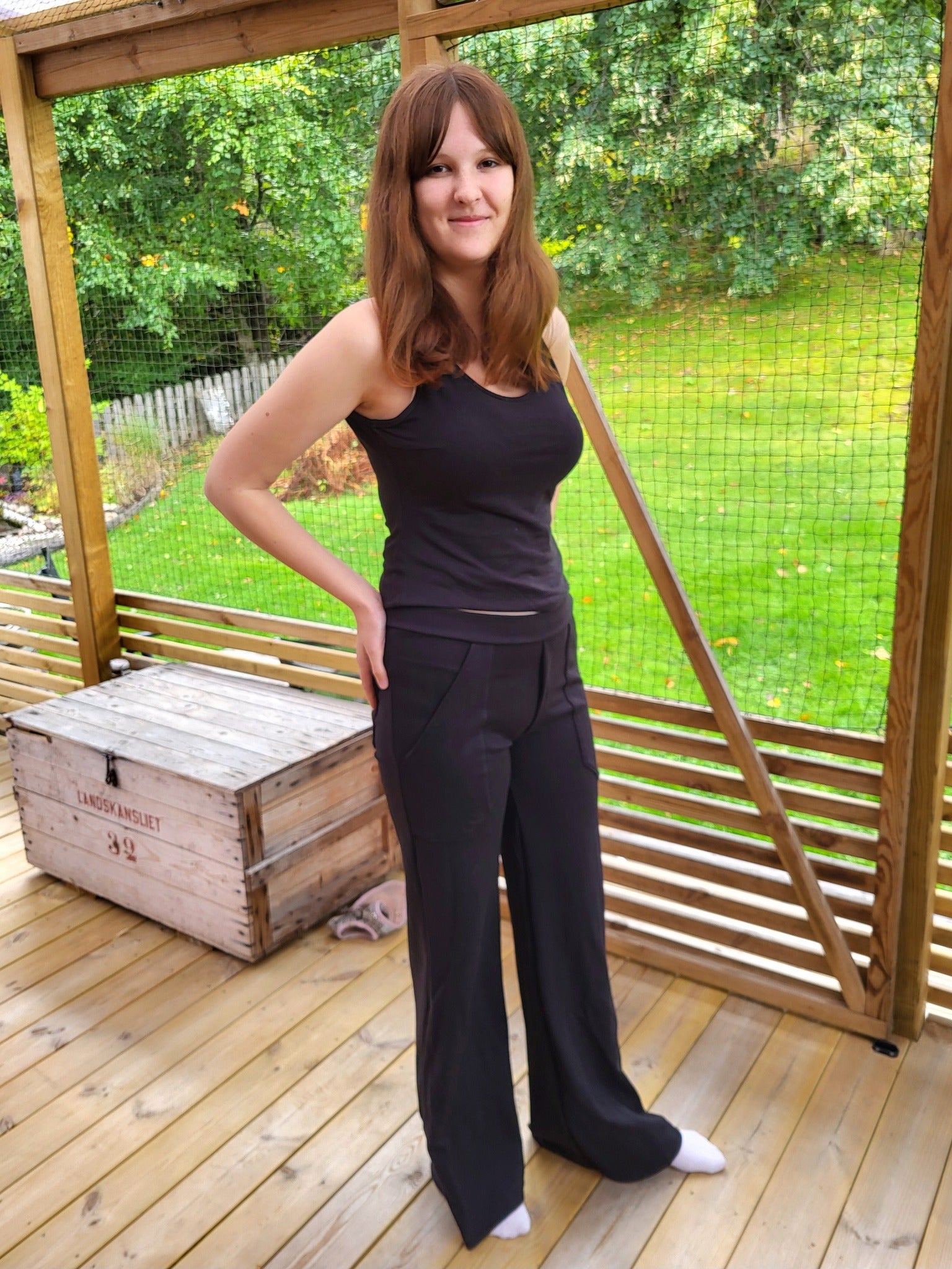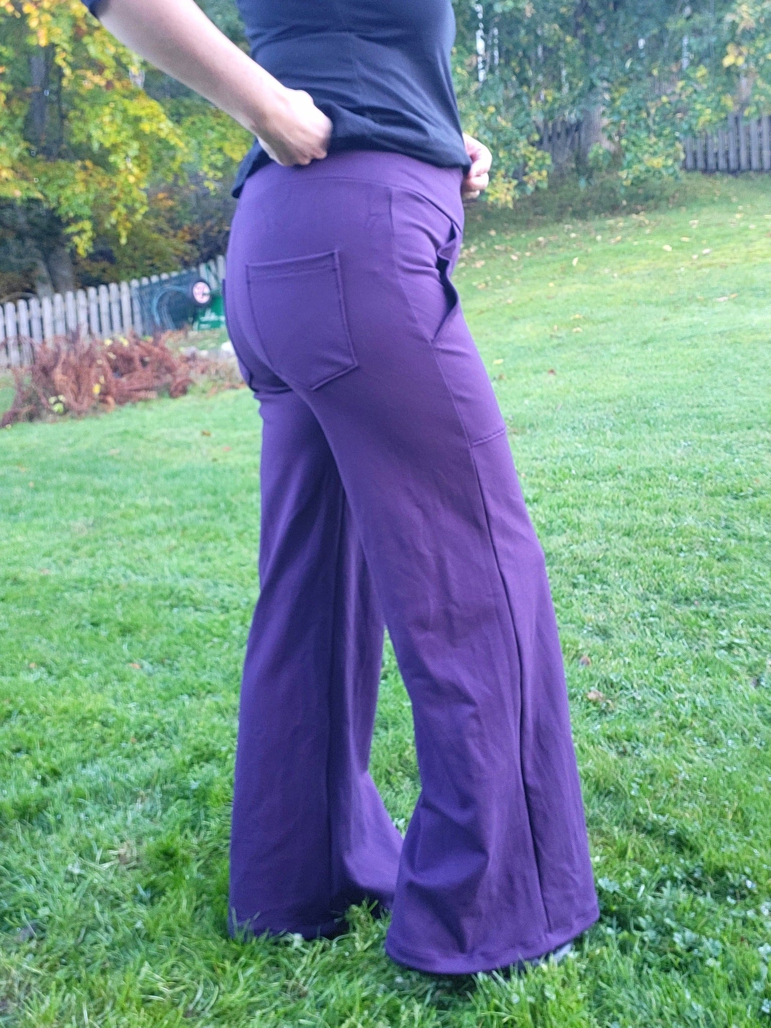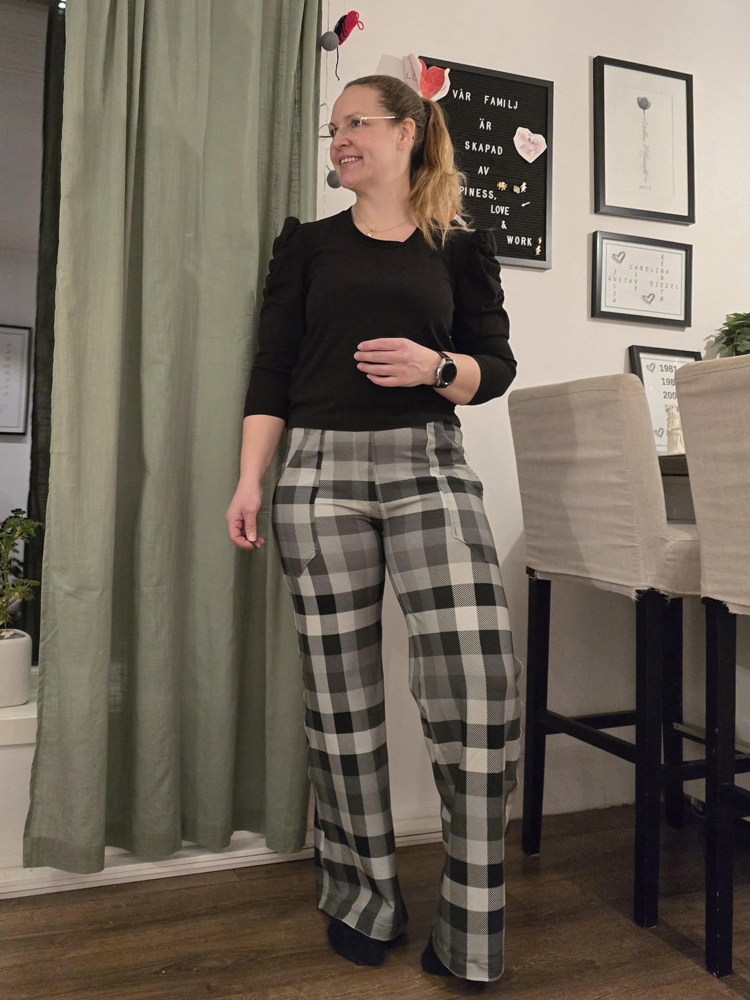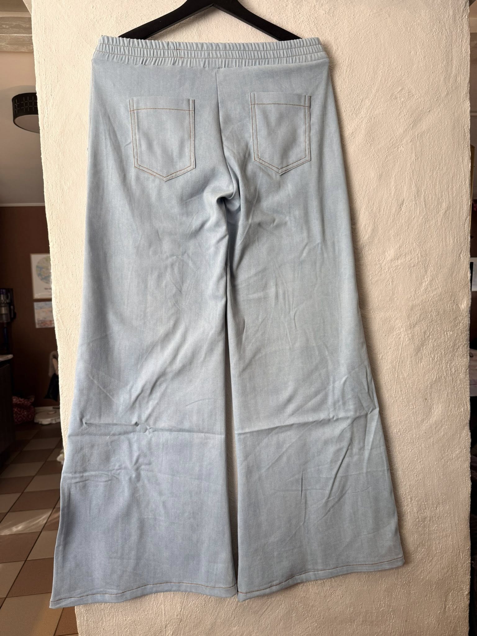 Material och tillklippning: Sys i stretchiga tyger med stretch på både bredd och höjd (har tyget inte stretch på höjden kan man behöva kompensera detta genom att höja dem ett par cm baktill), till exempel tunnare stretchjeans, stadig jersey eller andra modetyger.