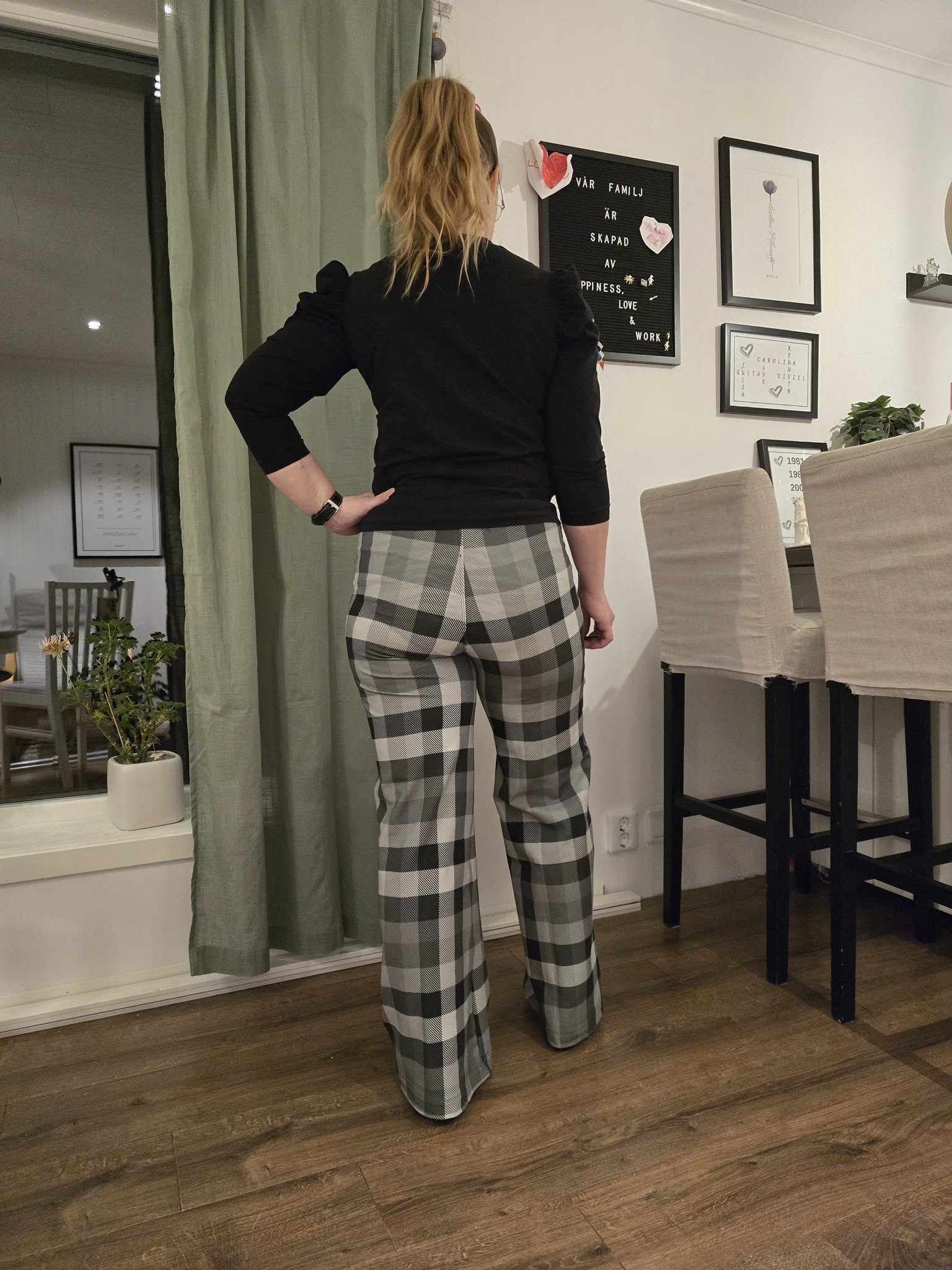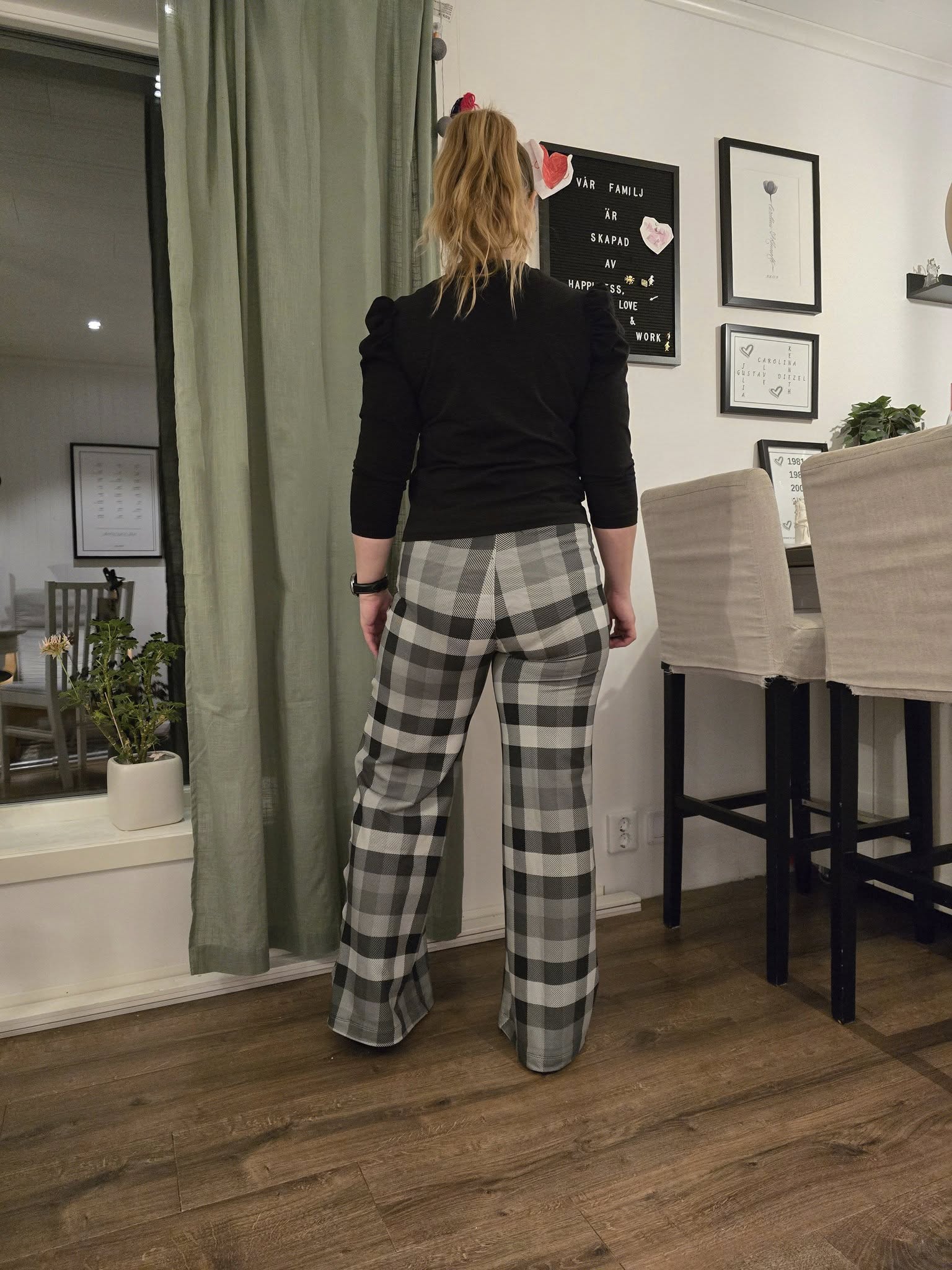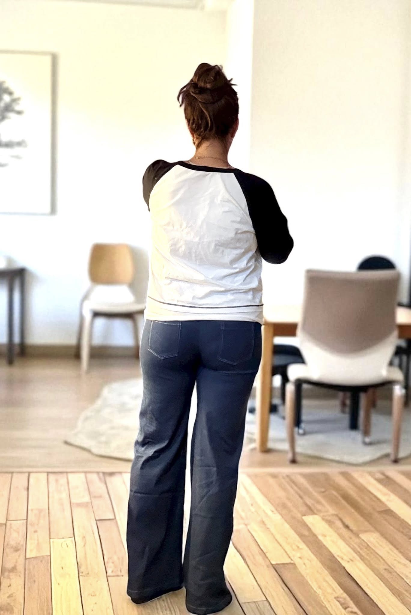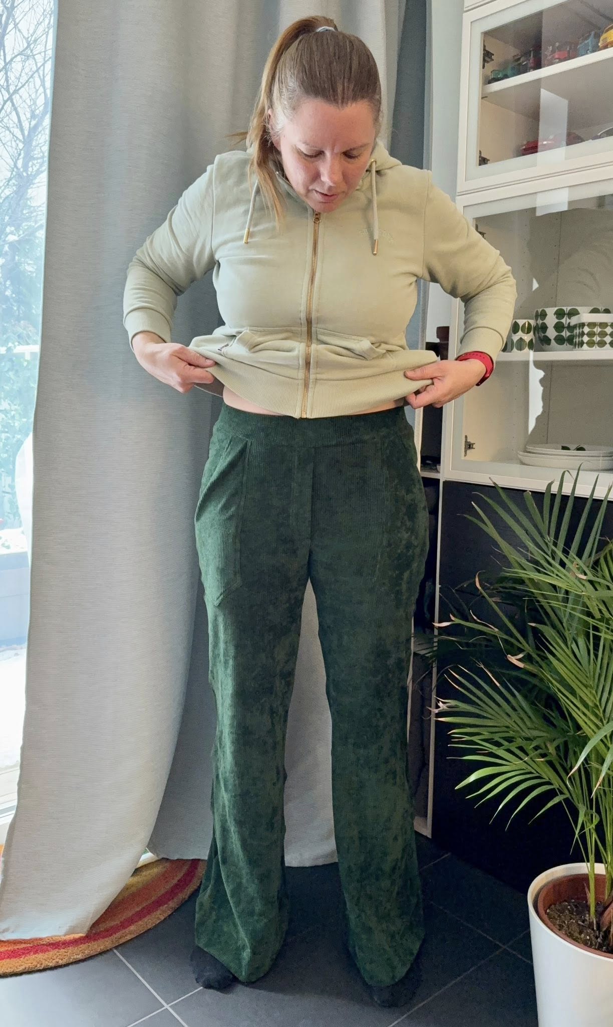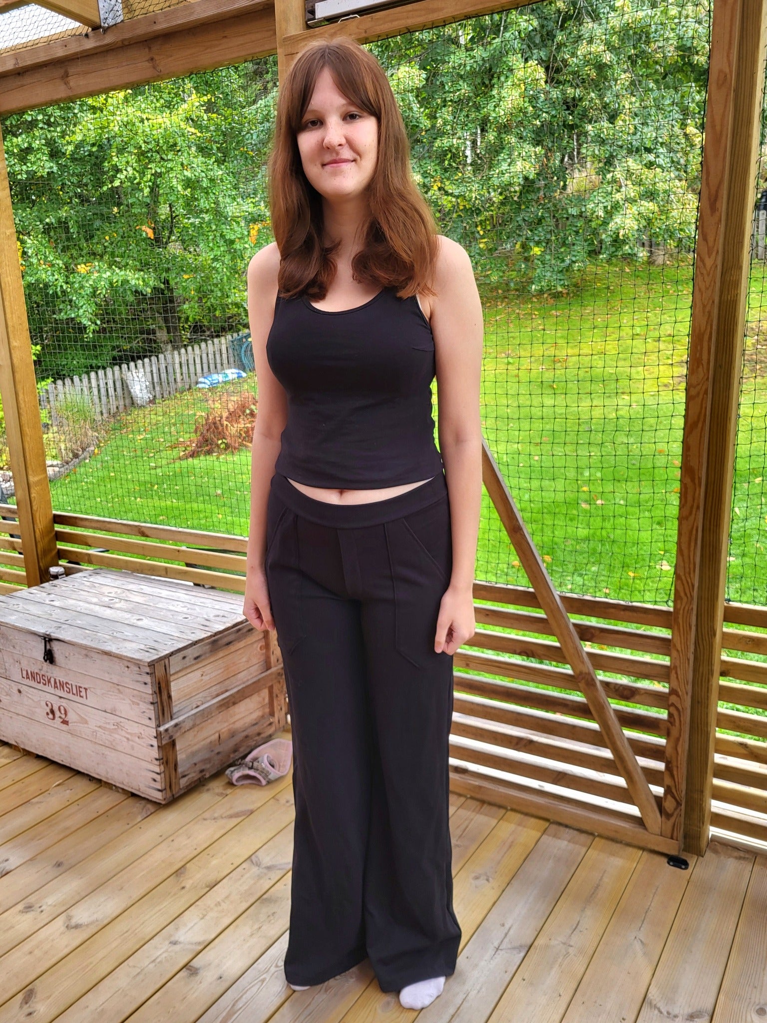 Material och tillklippning: Sys i stretchiga tyger med stretch på både bredd och höjd (har tyget inte stretch på höjden kan man behöva kompensera detta genom att höja dem ett par cm baktill), till exempel tunnare stretchjeans, stadig jersey eller andra modetyger.
