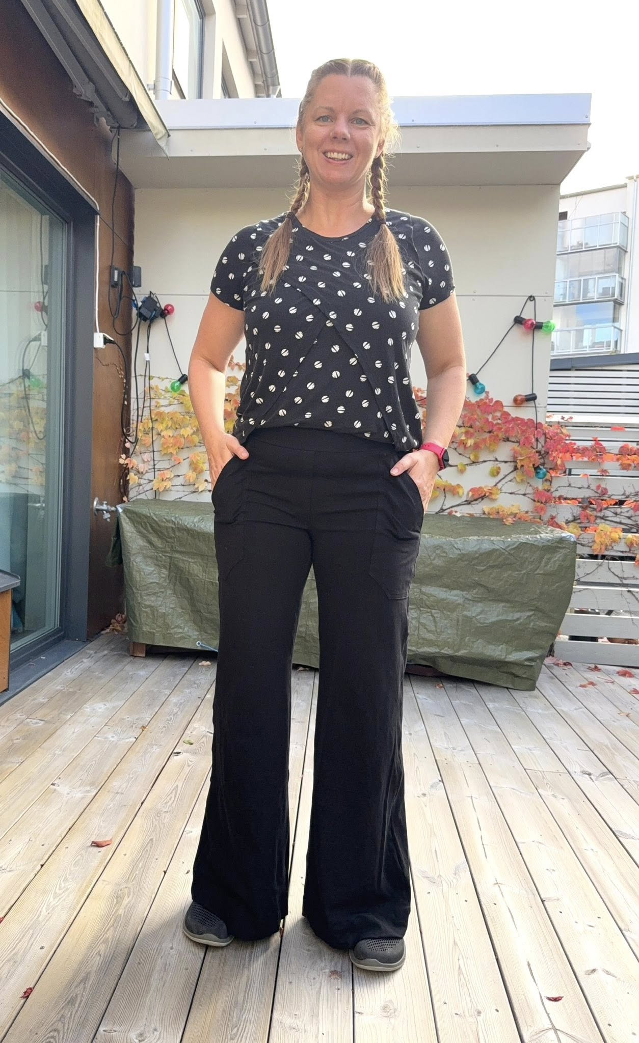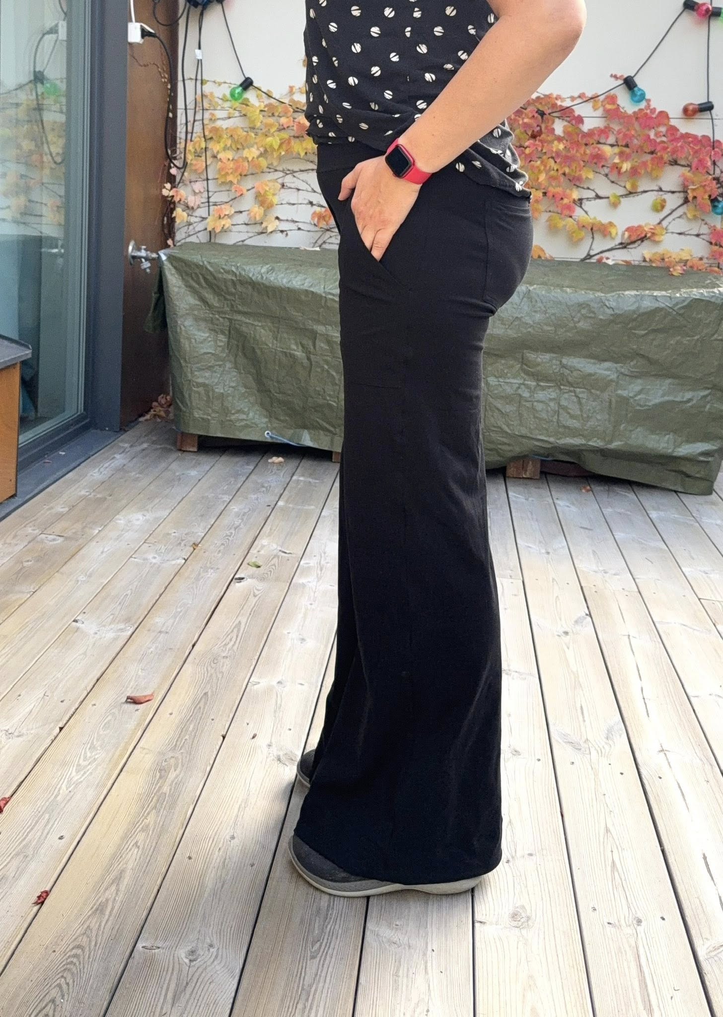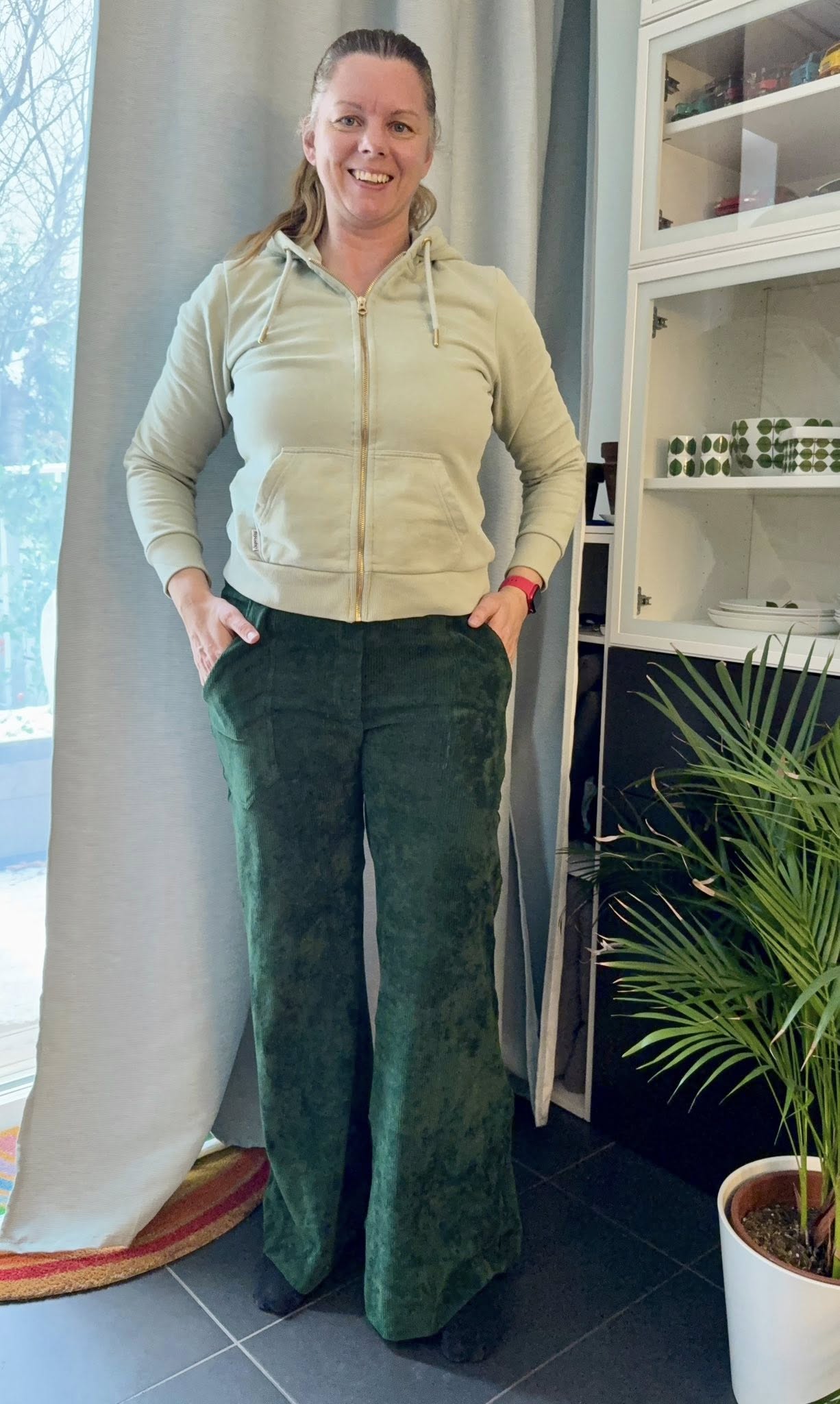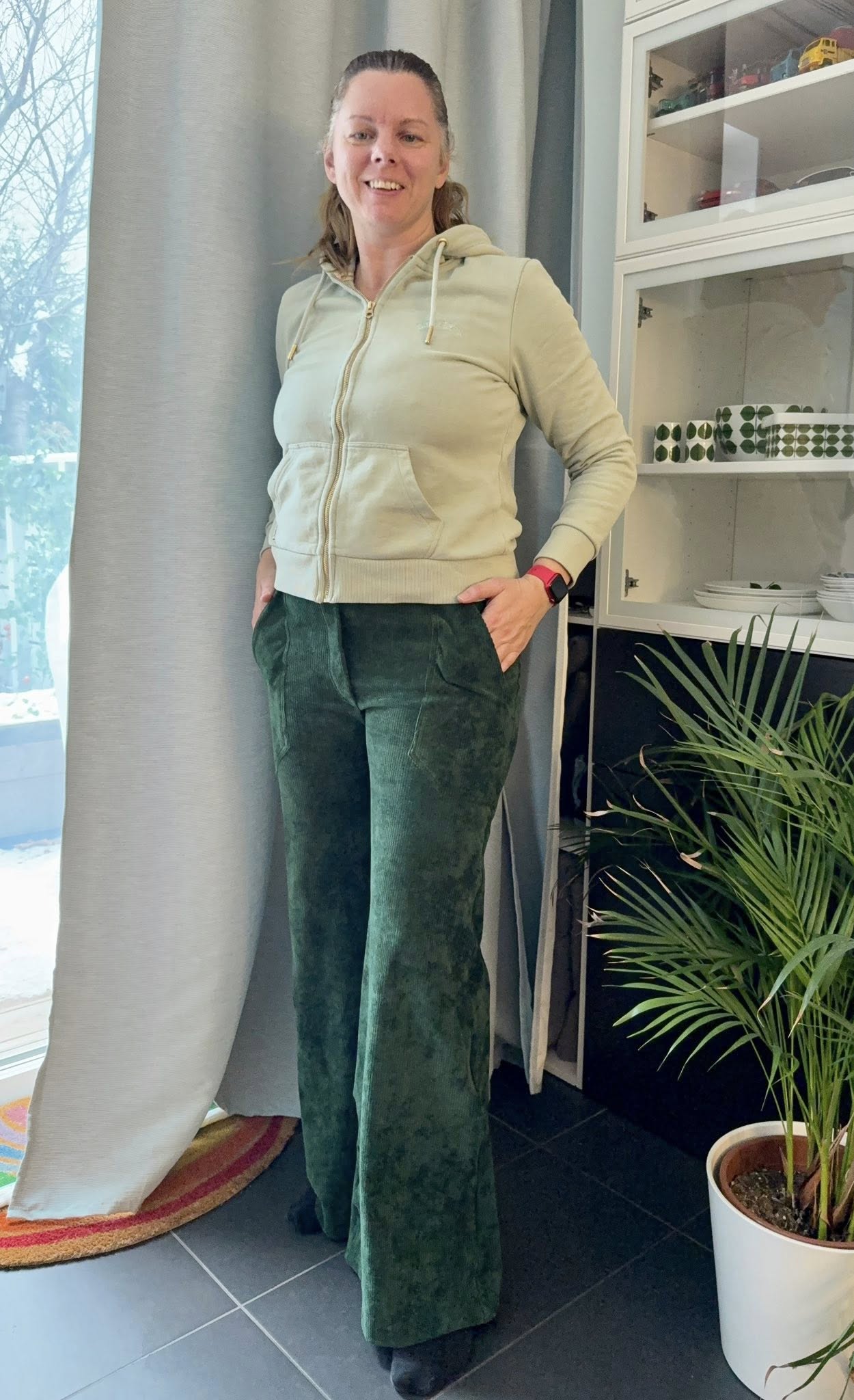 Material och tillklippning: Sys i stretchiga tyger med stretch på både bredd och höjd (har tyget inte stretch på höjden kan man behöva kompensera detta genom att höja dem ett par cm baktill), till exempel tunnare stretchjeans, stadig jersey eller andra modetyger.