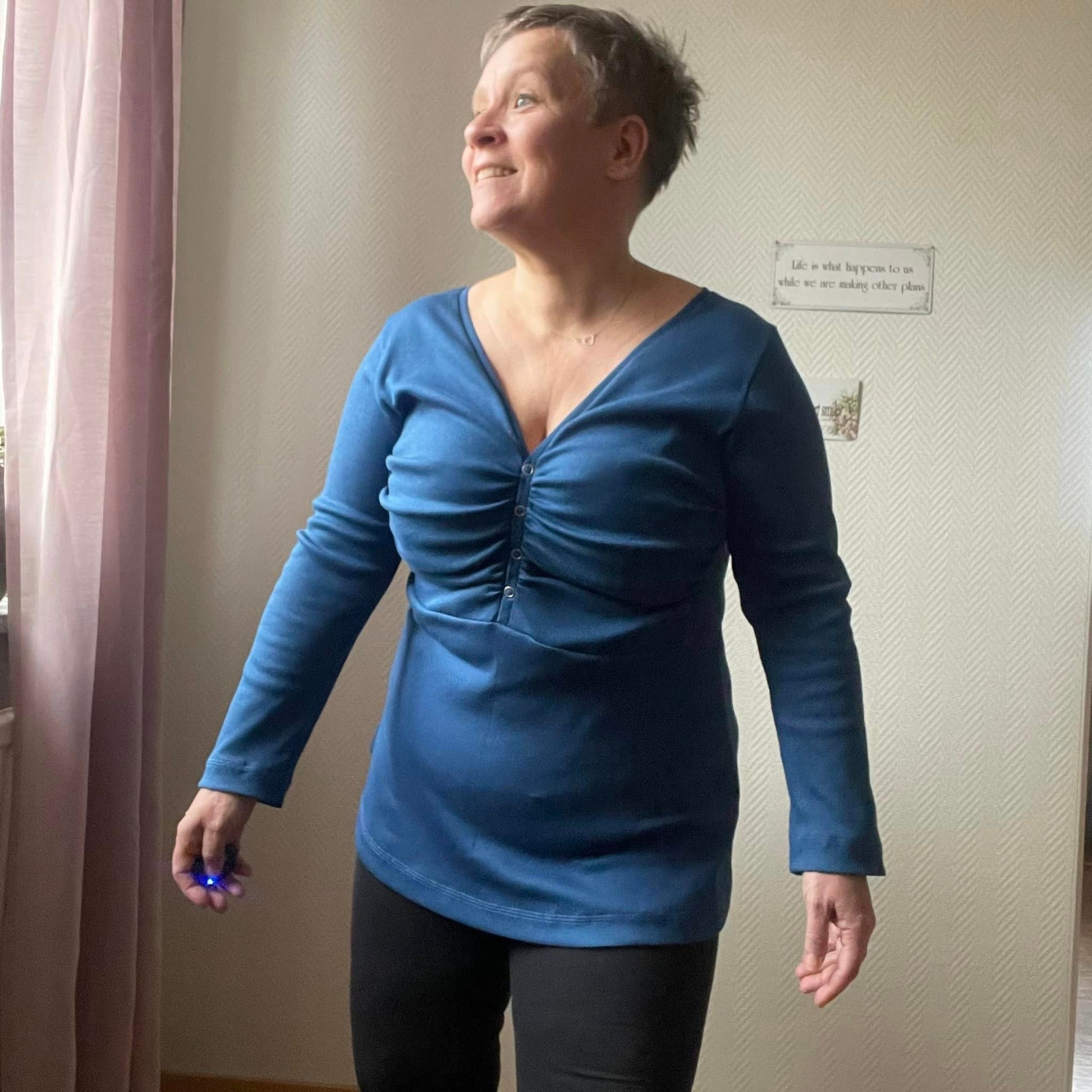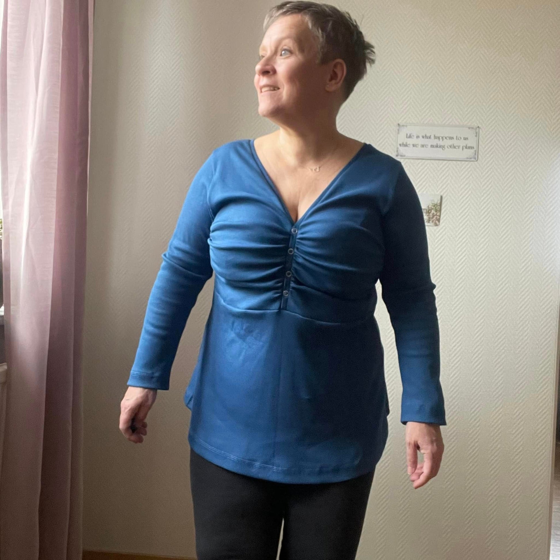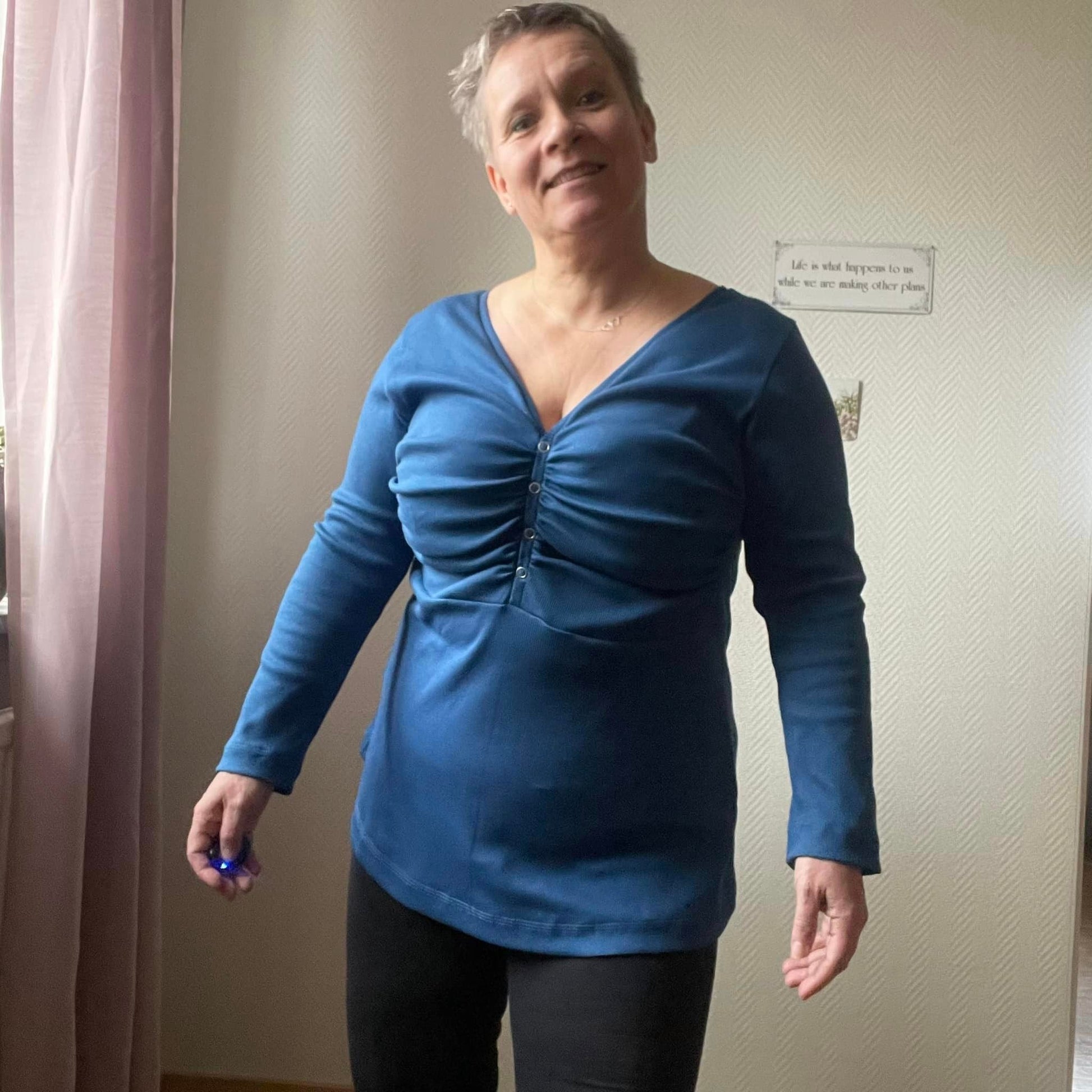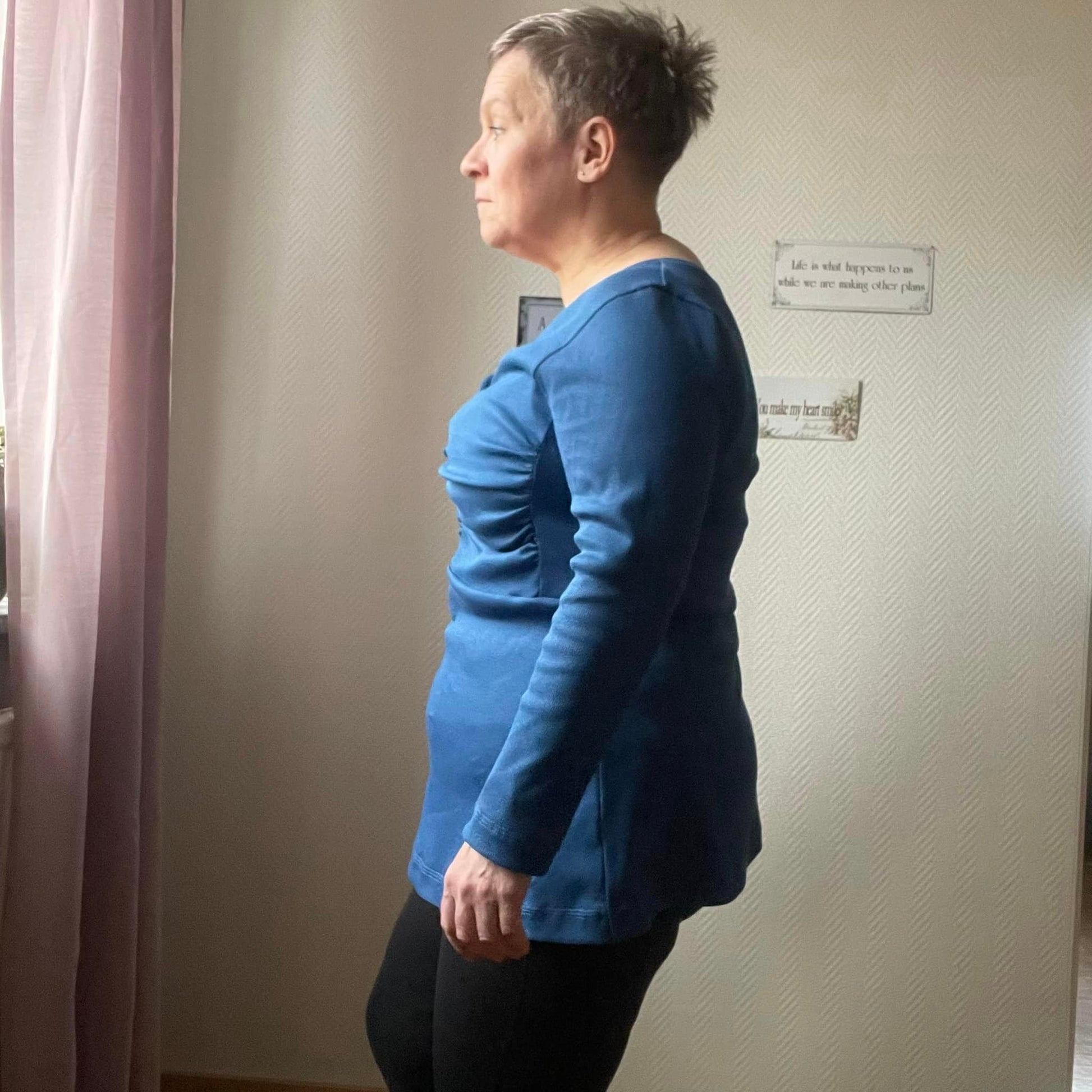 Material och tillklippning: Denna modell sys i jersey/trikå eller motsvarande. Syr man med blixtlås tillkommer ett sådant på ca 18 cm (går att korta av om man har längre blixtlås) samt kantband till halsringningen (35 mm brett eller den bredd som passar i bandkantaren om man äger en sådan). Syr man med knapplist tillkommer en liten bit vliseline samt knappar (4-5 st tryckknappar eller vanliga).