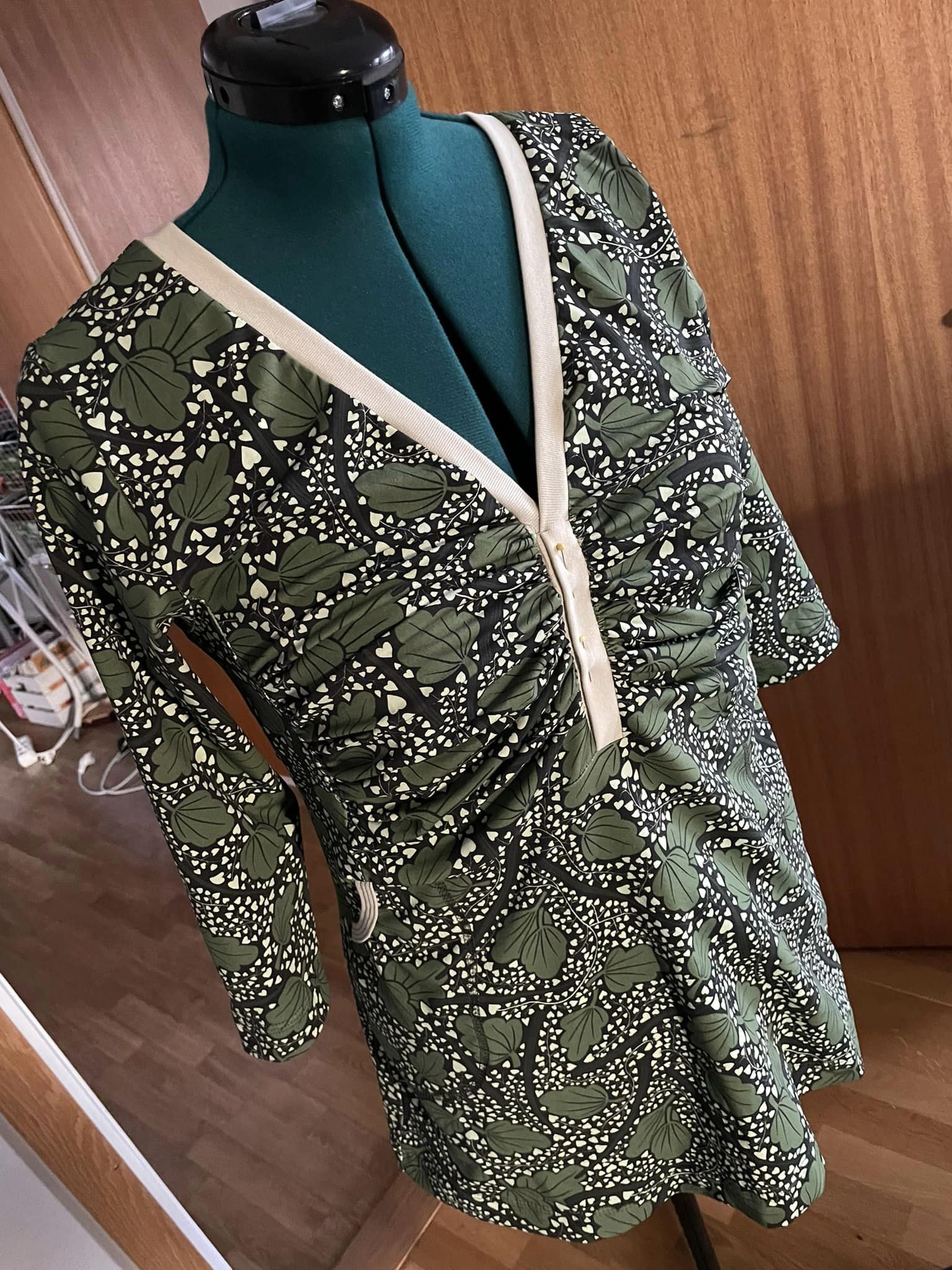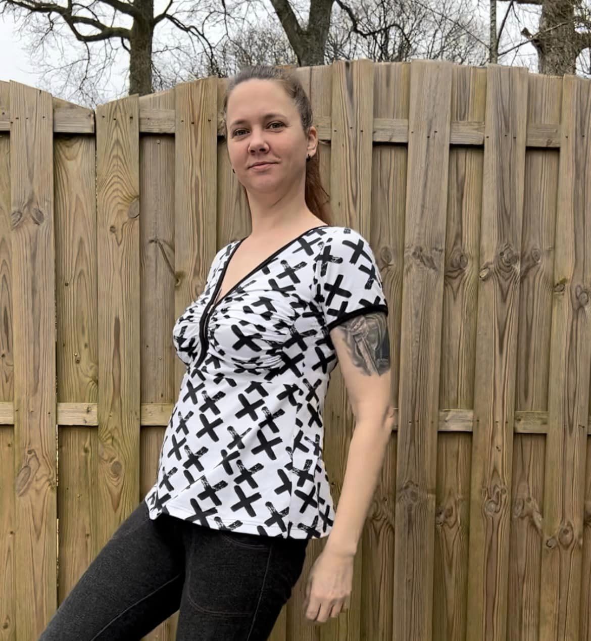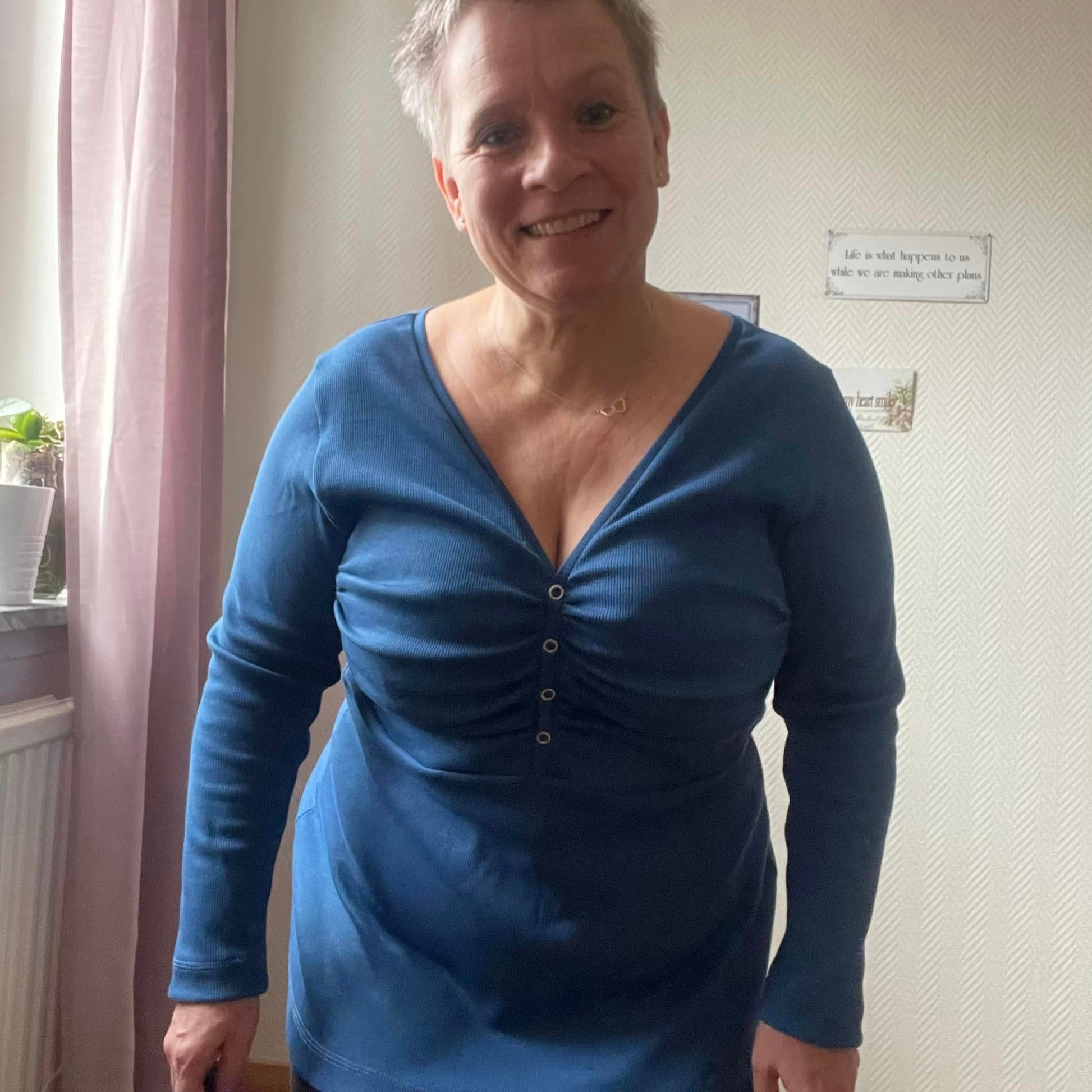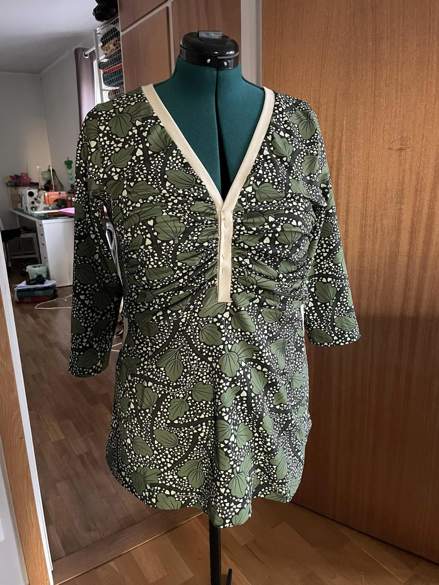 Material och tillklippning: Denna modell sys i jersey/trikå eller motsvarande. Syr man med blixtlås tillkommer ett sådant på ca 18 cm (går att korta av om man har längre blixtlås) samt kantband till halsringningen (35 mm brett eller den bredd som passar i bandkantaren om man äger en sådan). Syr man med knapplist tillkommer en liten bit vliseline samt knappar (4-5 st tryckknappar eller vanliga).