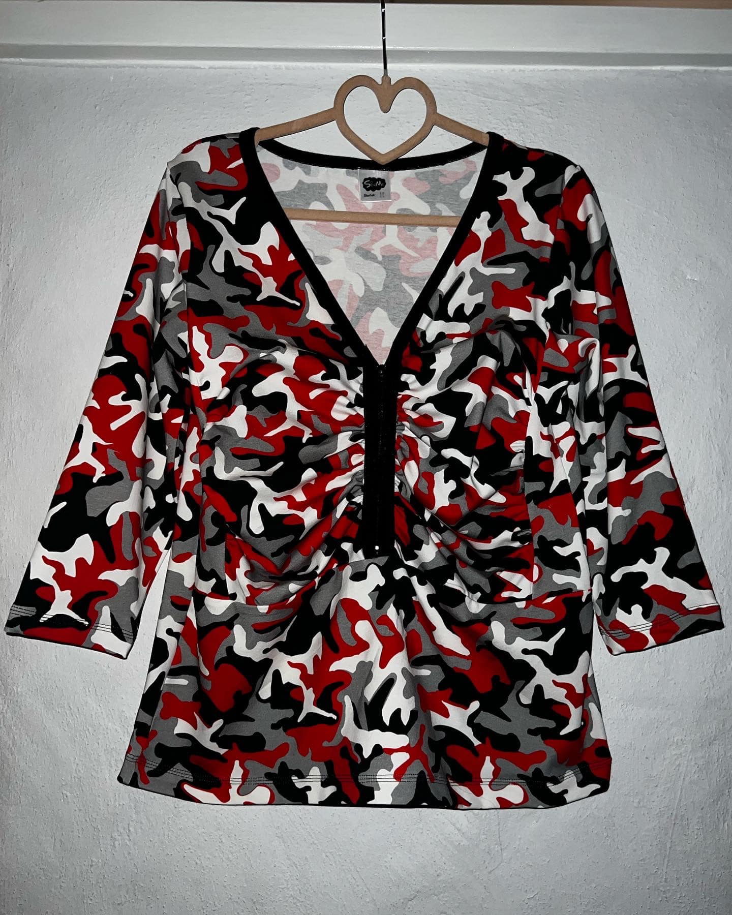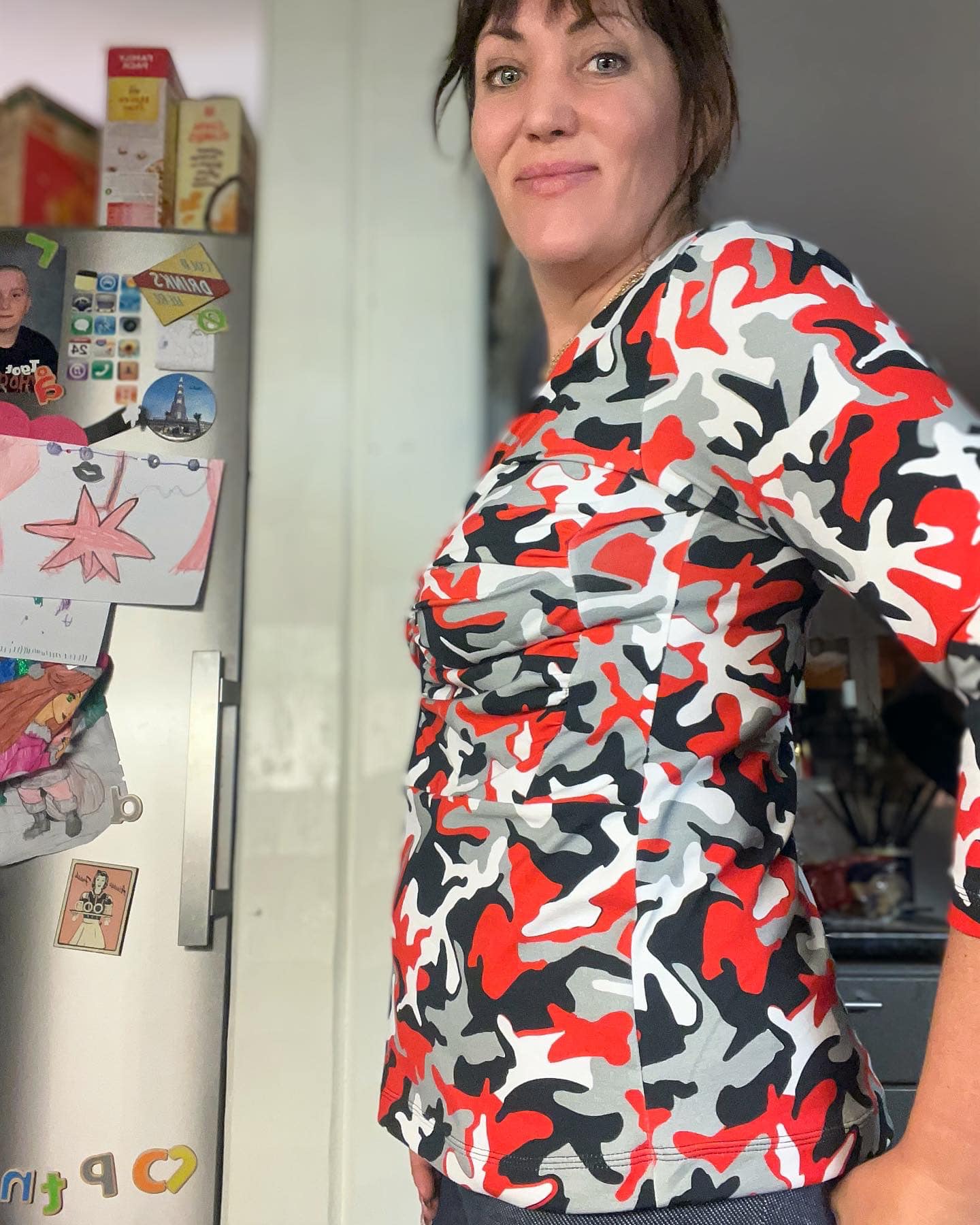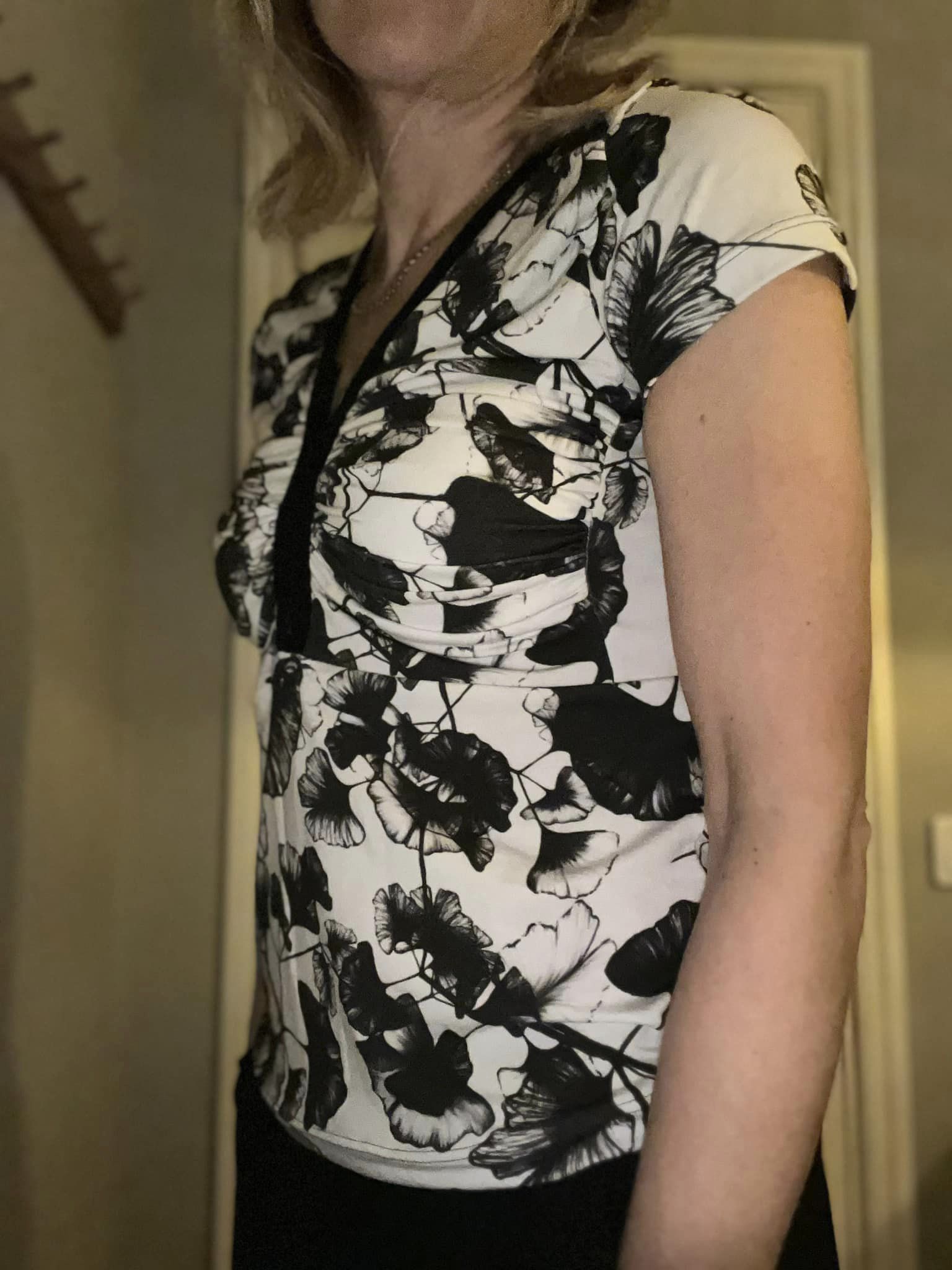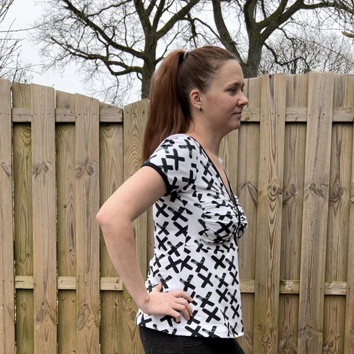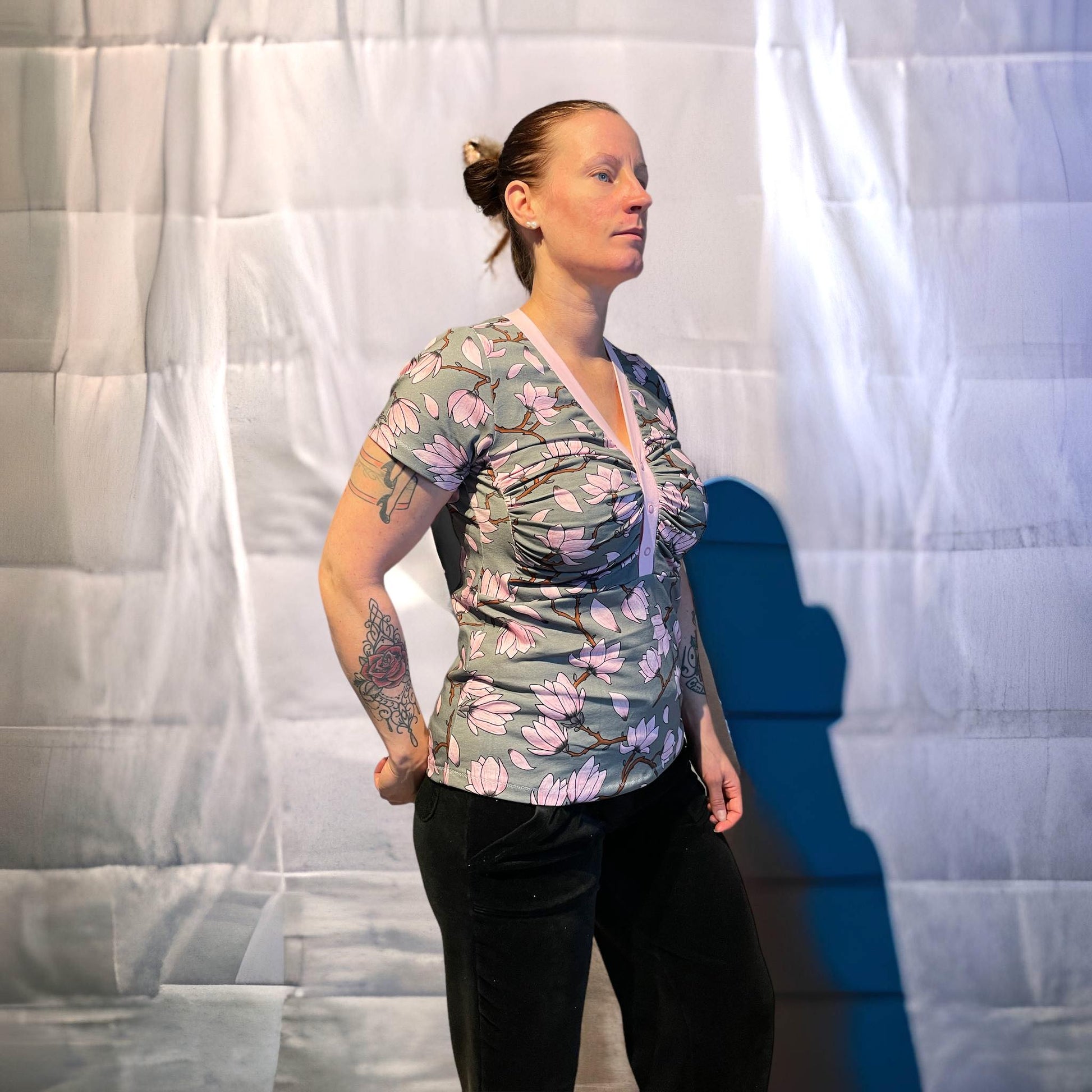 Material och tillklippning: Denna modell sys i jersey/trikå eller motsvarande. Syr man med blixtlås tillkommer ett sådant på ca 18 cm (går att korta av om man har längre blixtlås) samt kantband till halsringningen (35 mm brett eller den bredd som passar i bandkantaren om man äger en sådan). Syr man med knapplist tillkommer en liten bit vliseline samt knappar (4-5 st tryckknappar eller vanliga).