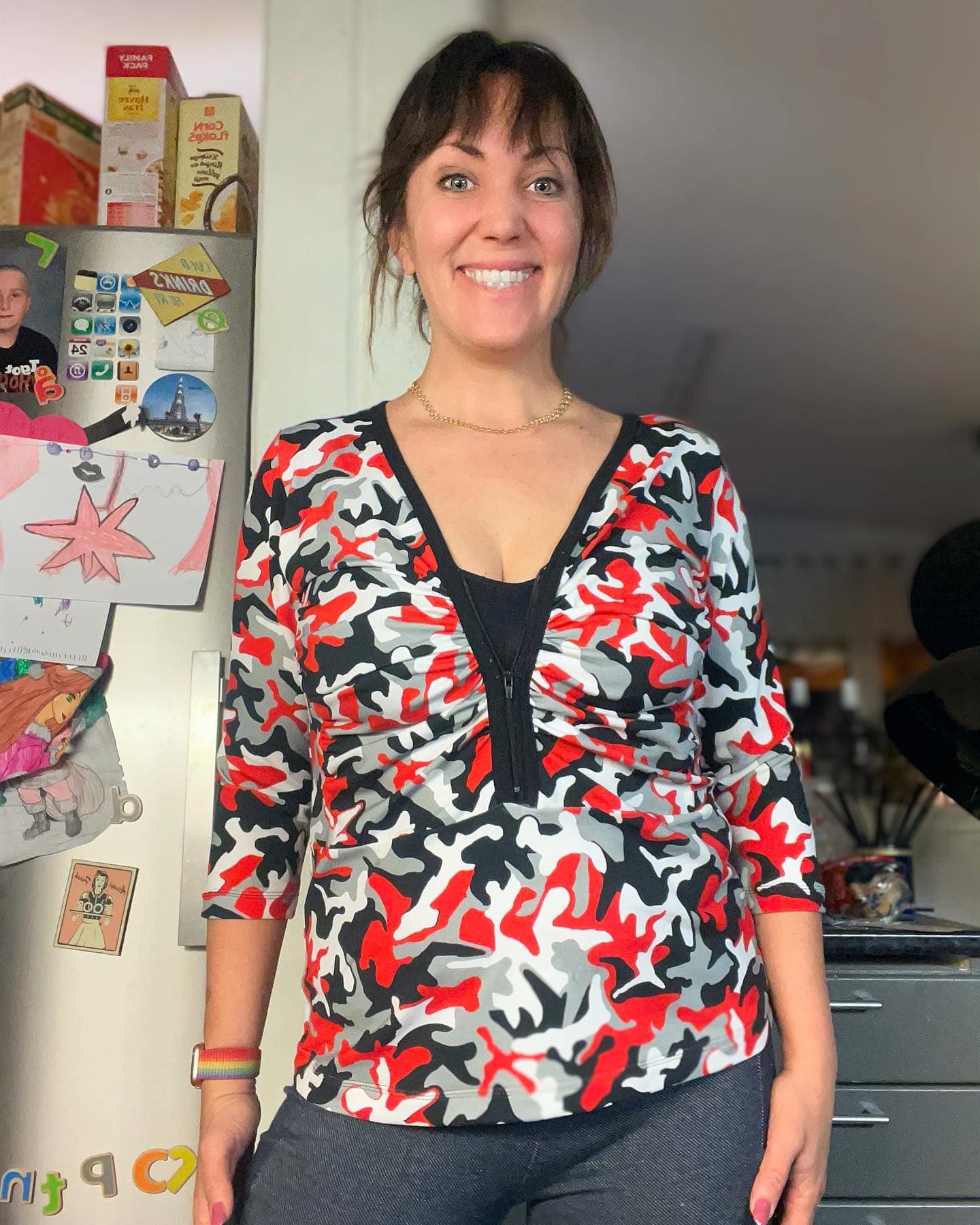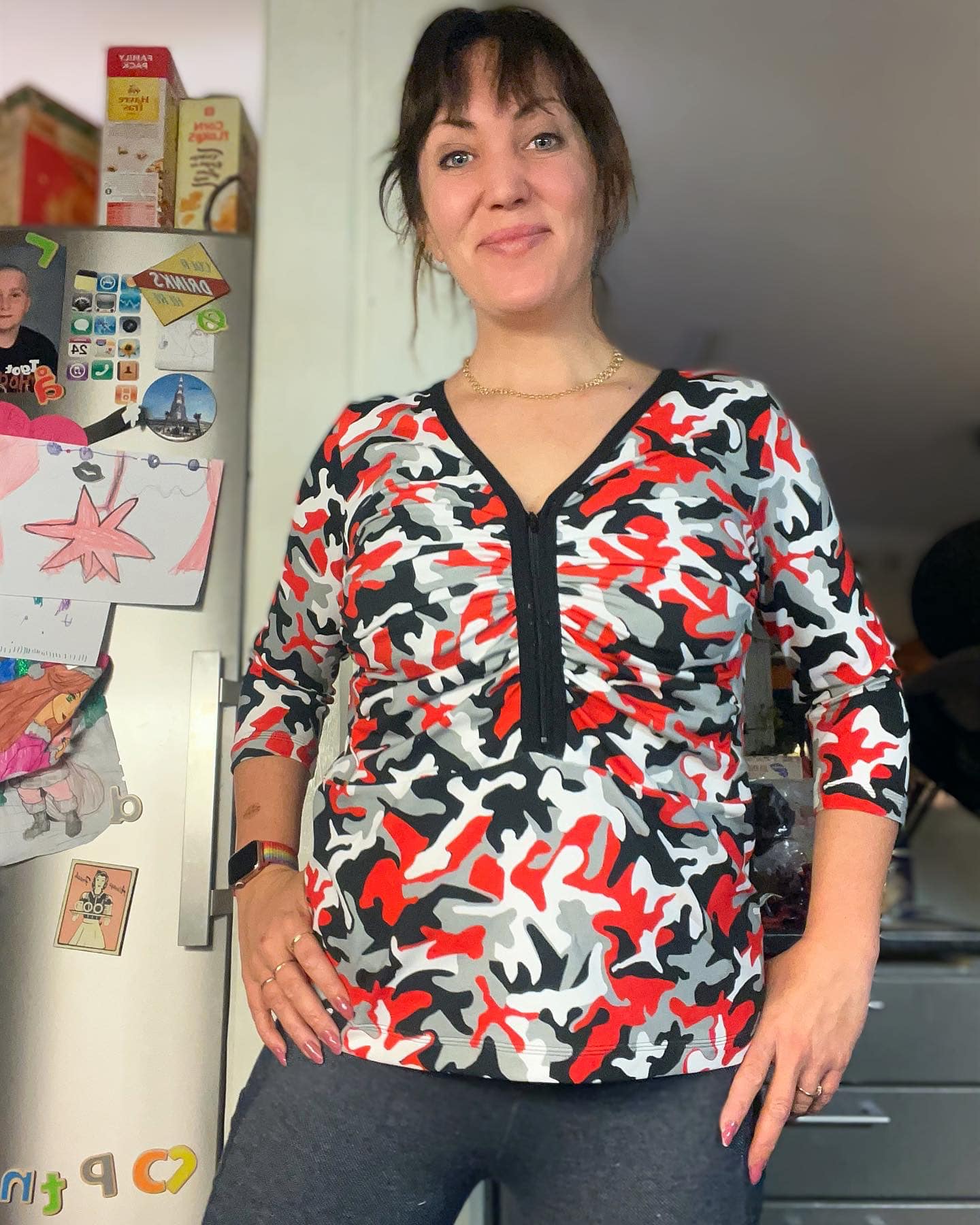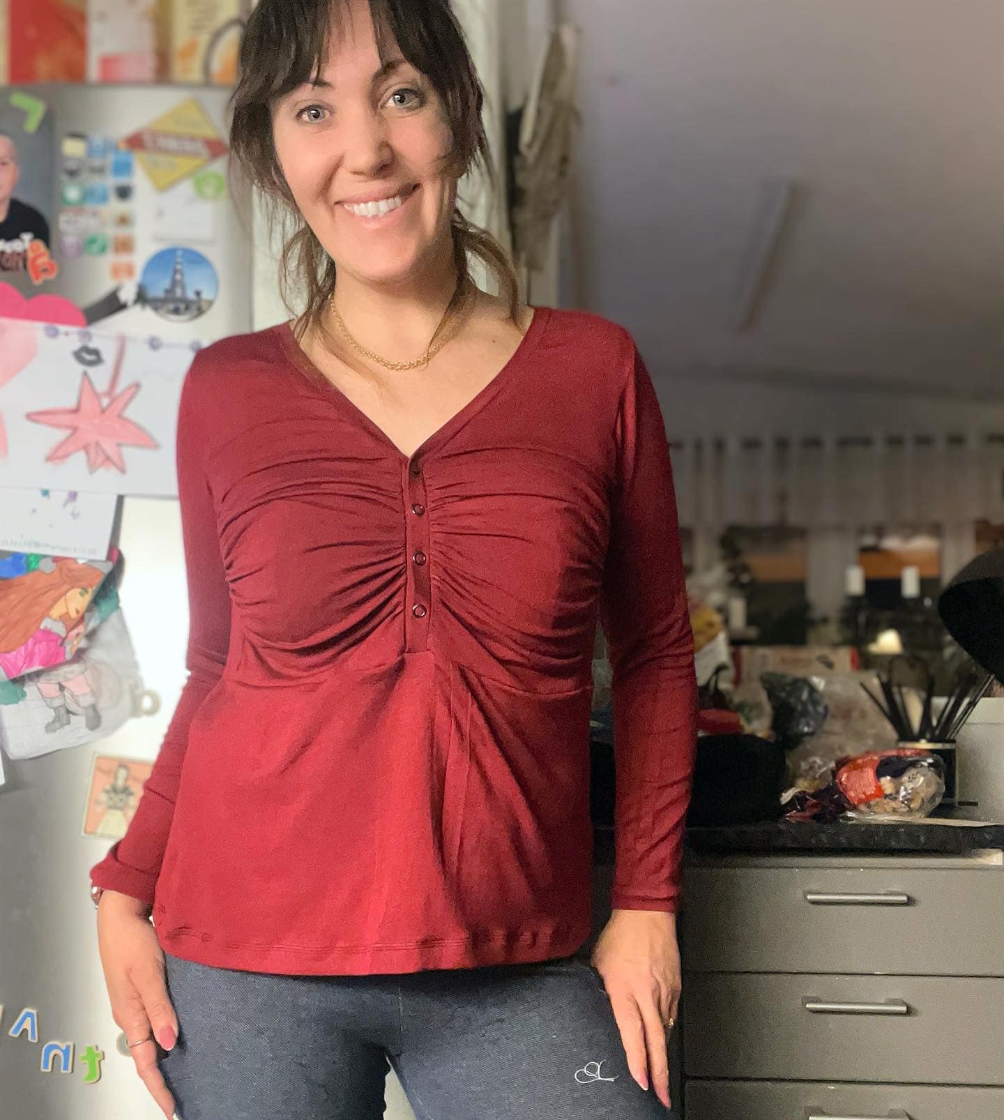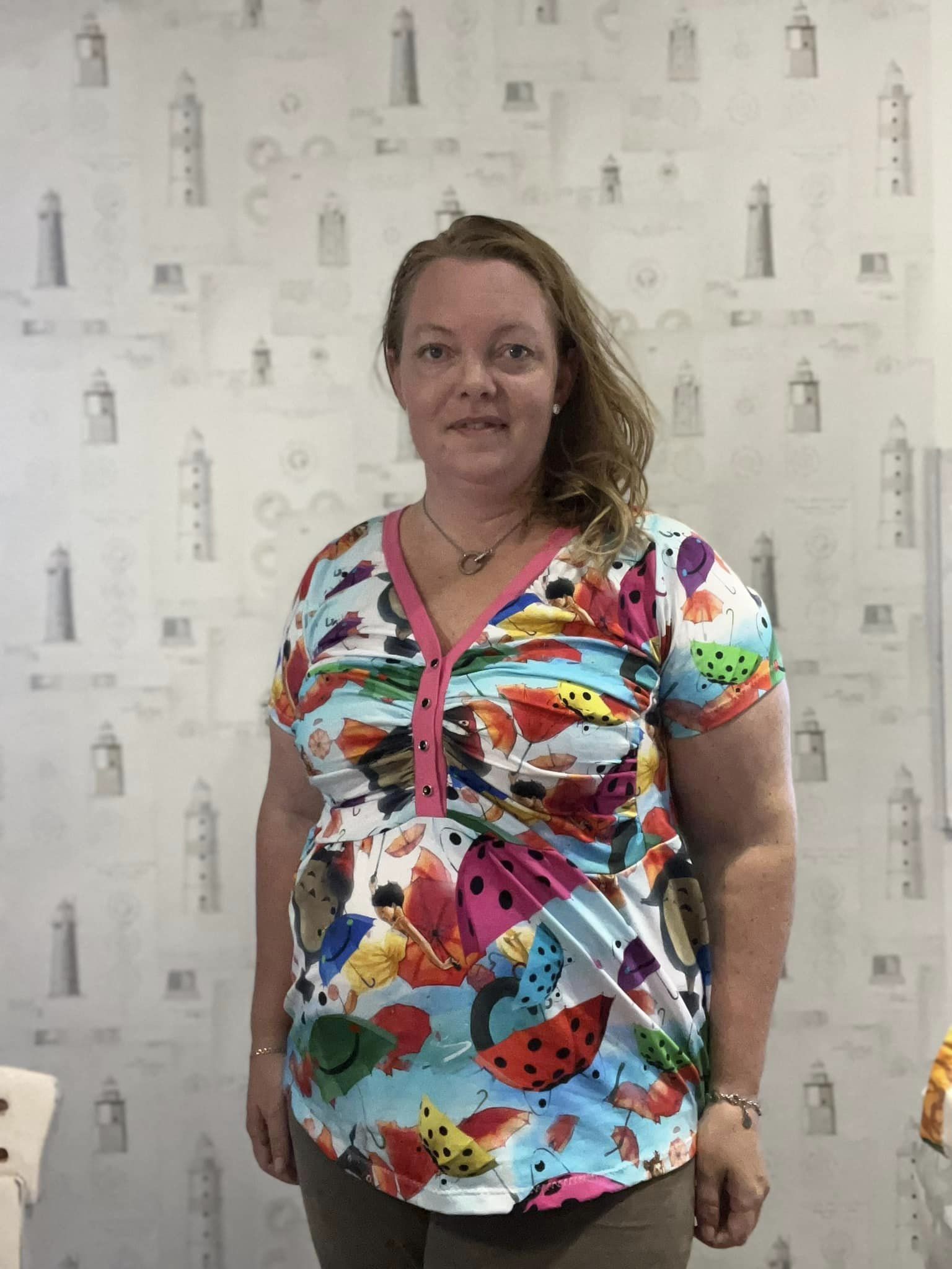 Material och tillklippning: Denna modell sys i jersey/trikå eller motsvarande. Syr man med blixtlås tillkommer ett sådant på ca 18 cm (går att korta av om man har längre blixtlås) samt kantband till halsringningen (35 mm brett eller den bredd som passar i bandkantaren om man äger en sådan). Syr man med knapplist tillkommer en liten bit vliseline samt knappar (4-5 st tryckknappar eller vanliga).