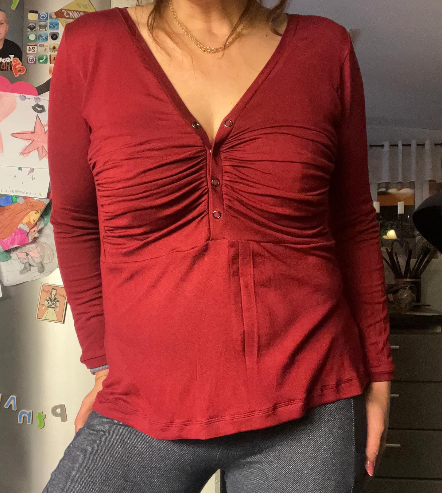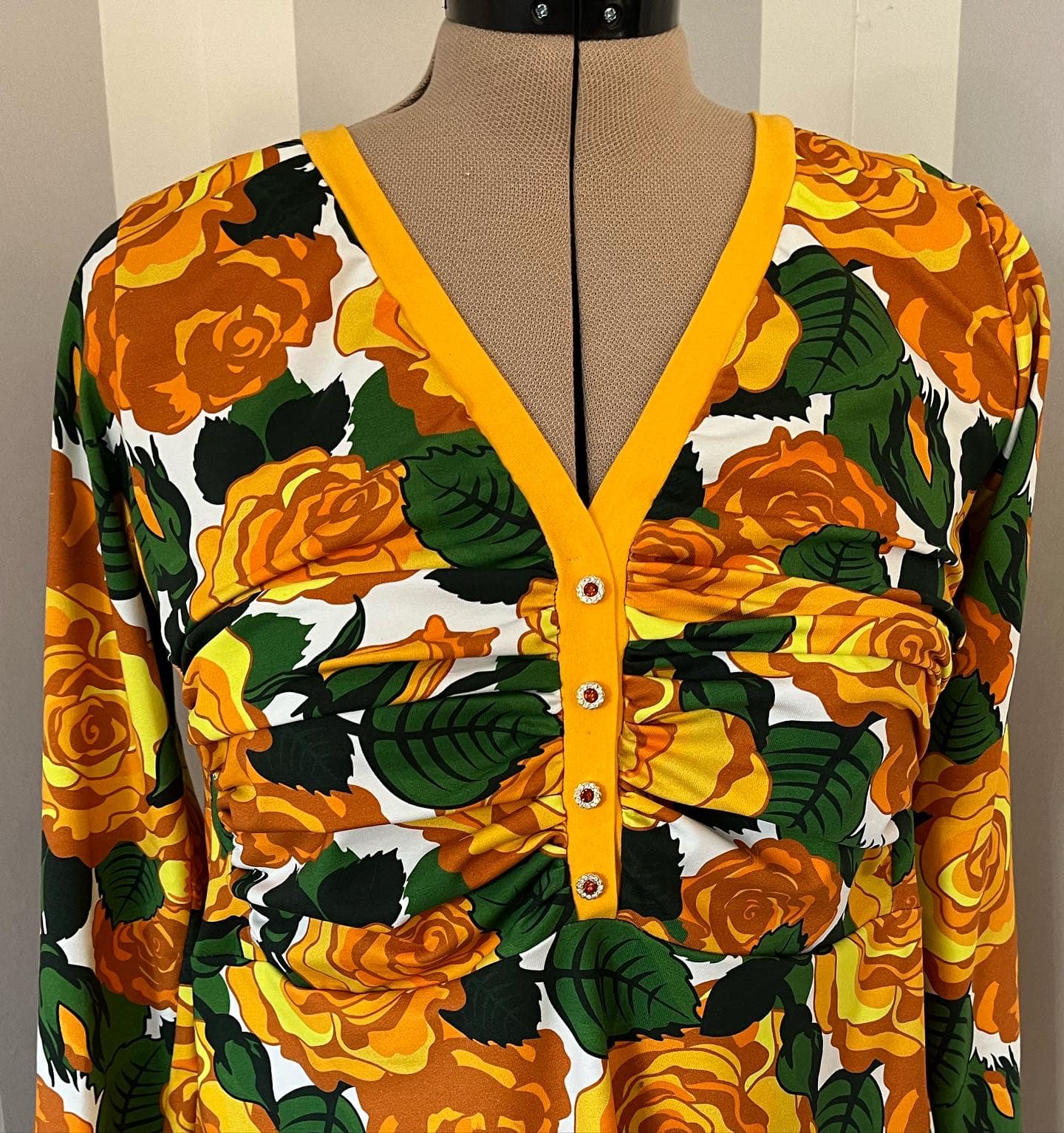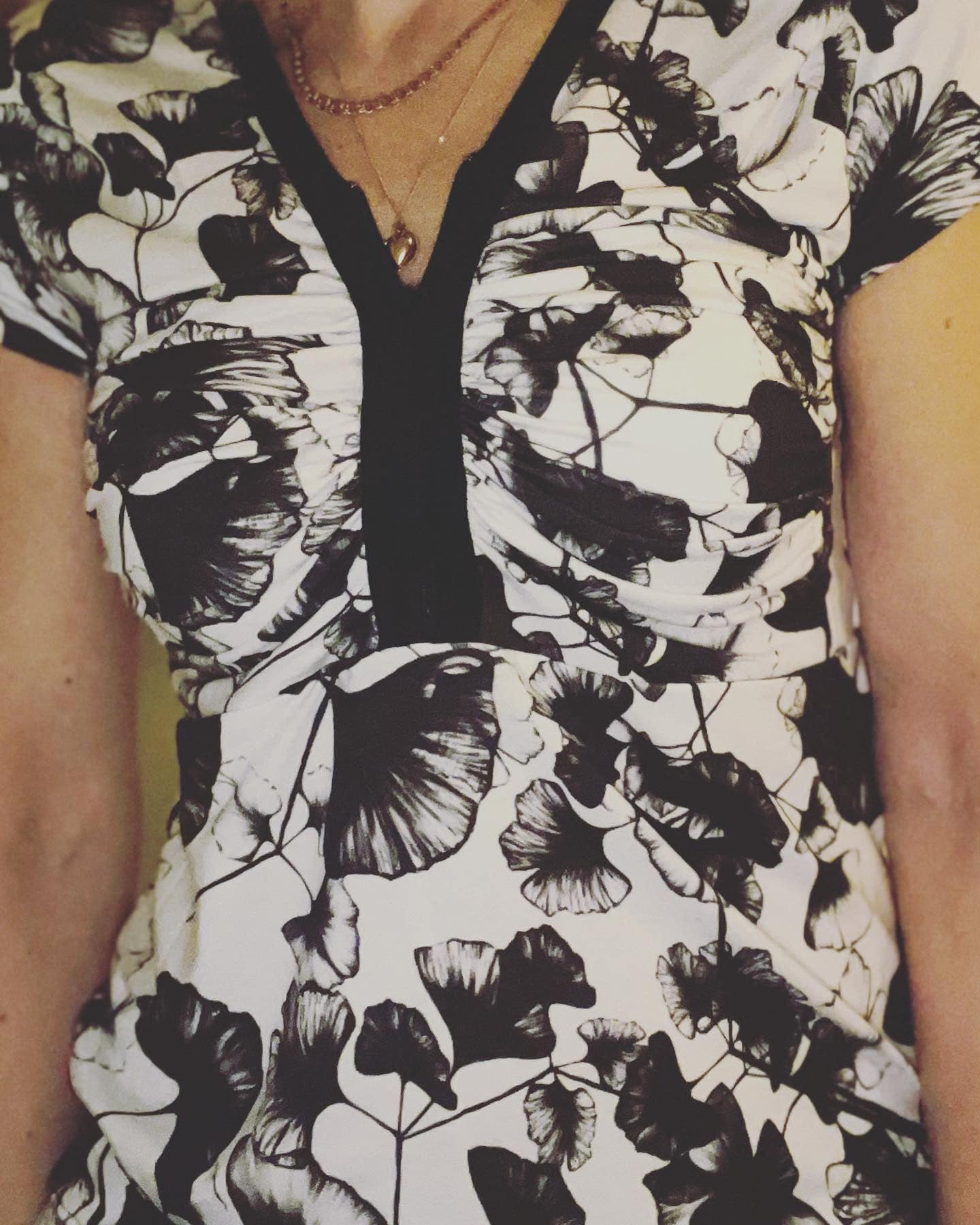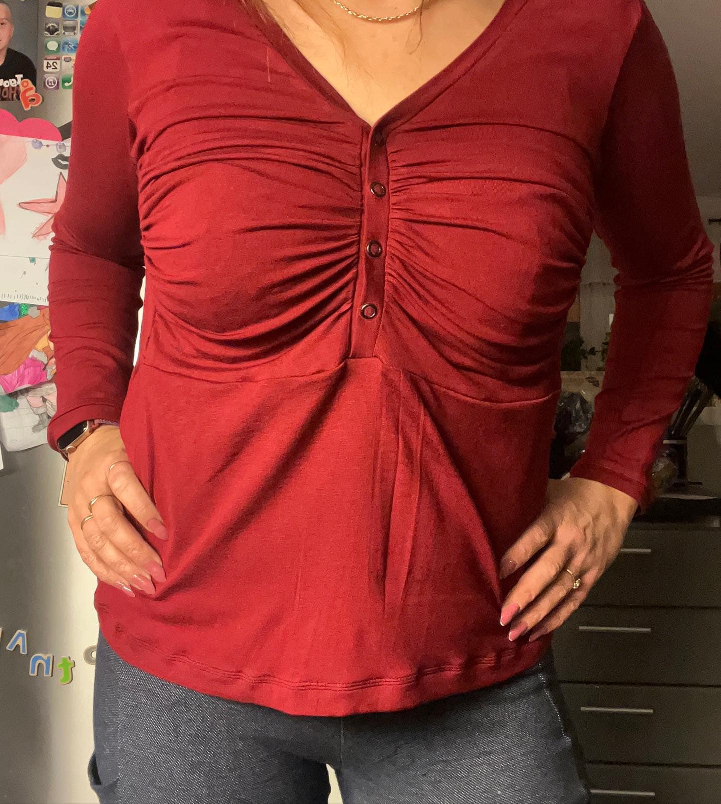 Material och tillklippning: Denna modell sys i jersey/trikå eller motsvarande. Syr man med blixtlås tillkommer ett sådant på ca 18 cm (går att korta av om man har längre blixtlås) samt kantband till halsringningen (35 mm brett eller den bredd som passar i bandkantaren om man äger en sådan). Syr man med knapplist tillkommer en liten bit vliseline samt knappar (4-5 st tryckknappar eller vanliga).