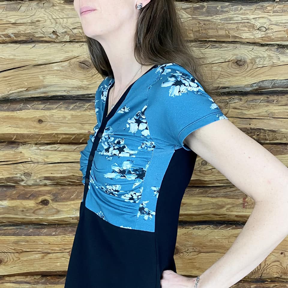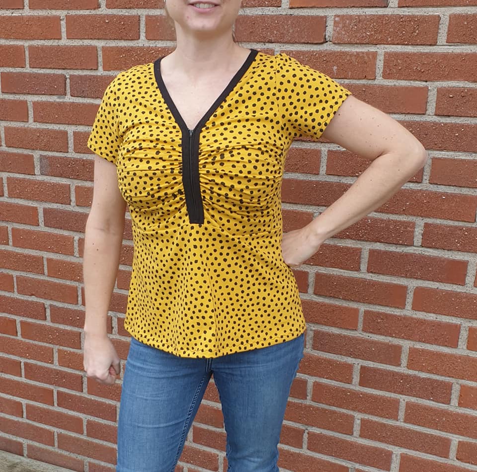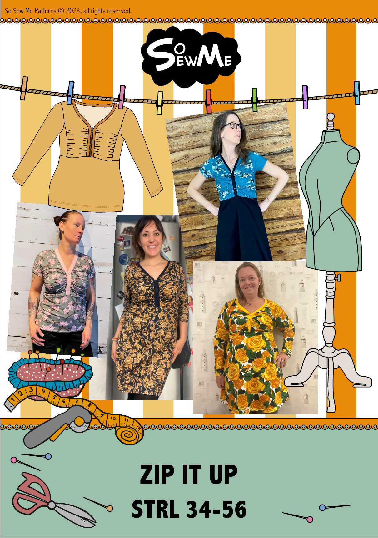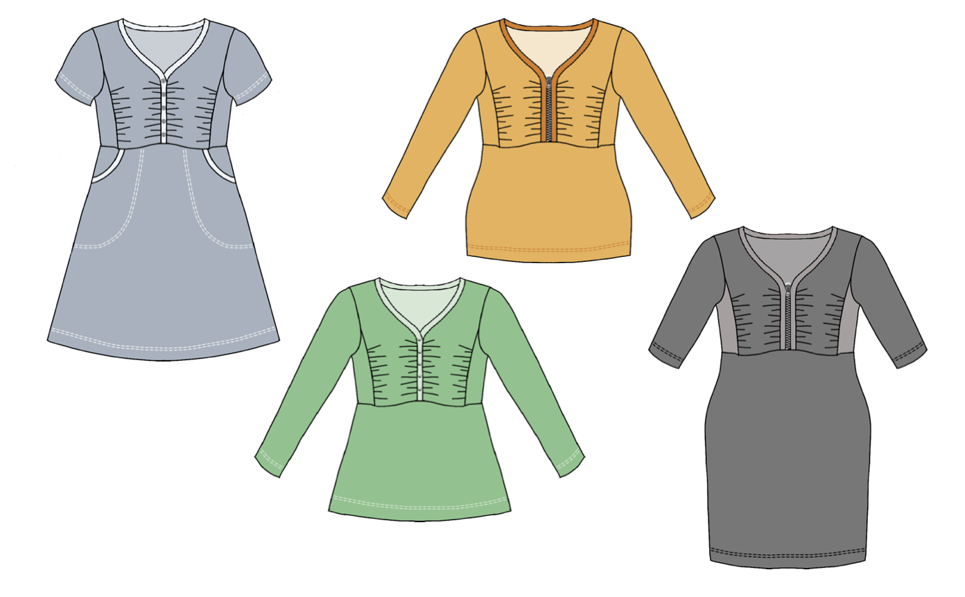 Zip it Up är en modern topp/klänning med draperat bystparti som ger ett arbetat intryck utan att vara alltför utmanande. Sys med antingen blixtlås eller knapplist i urringningen vilket gör den enkel att variera. Nederdelen går att sy figurnära eller utställd, och den utställda varianten har dessutom fickor.